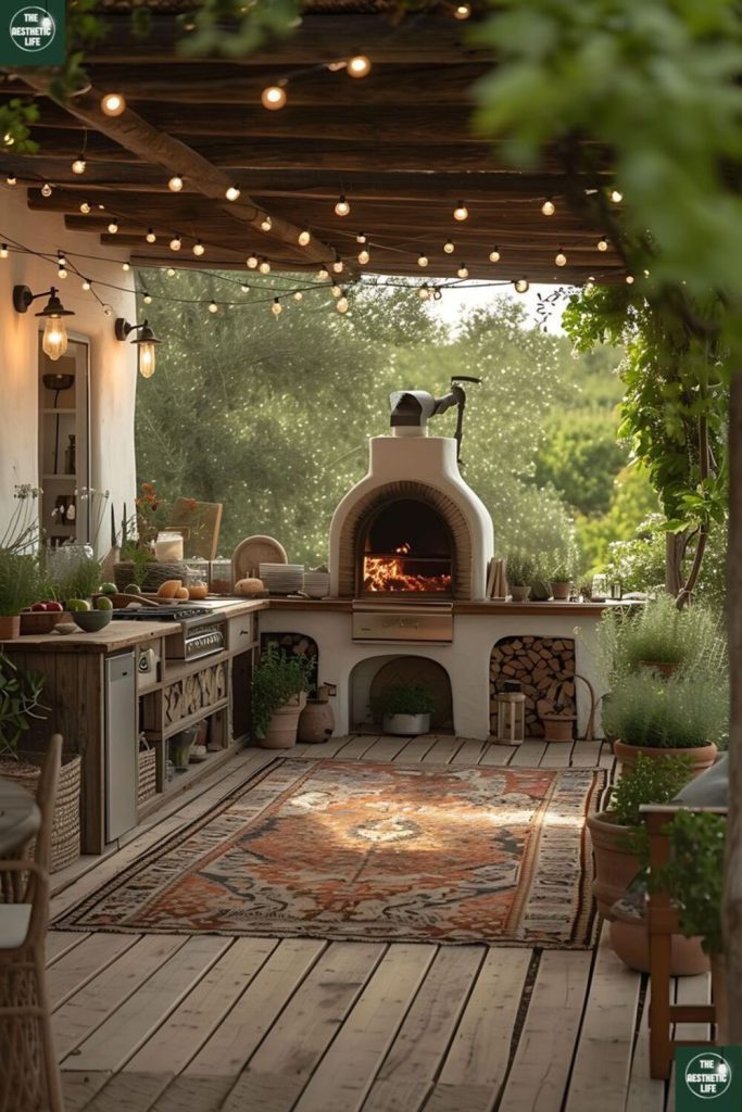This farmhouse outdoor kitchen feels warm. White walls and a wooden pergola make it cozy. The stone fireplace adds a touch of luxury. Woven bar stools use natural materials. Gray and beige colors feel soft and fresh. Host friends here for a fall barbecue! Use natural textures and calm colors to get this look. Share your farmhouse ideas in the comments.