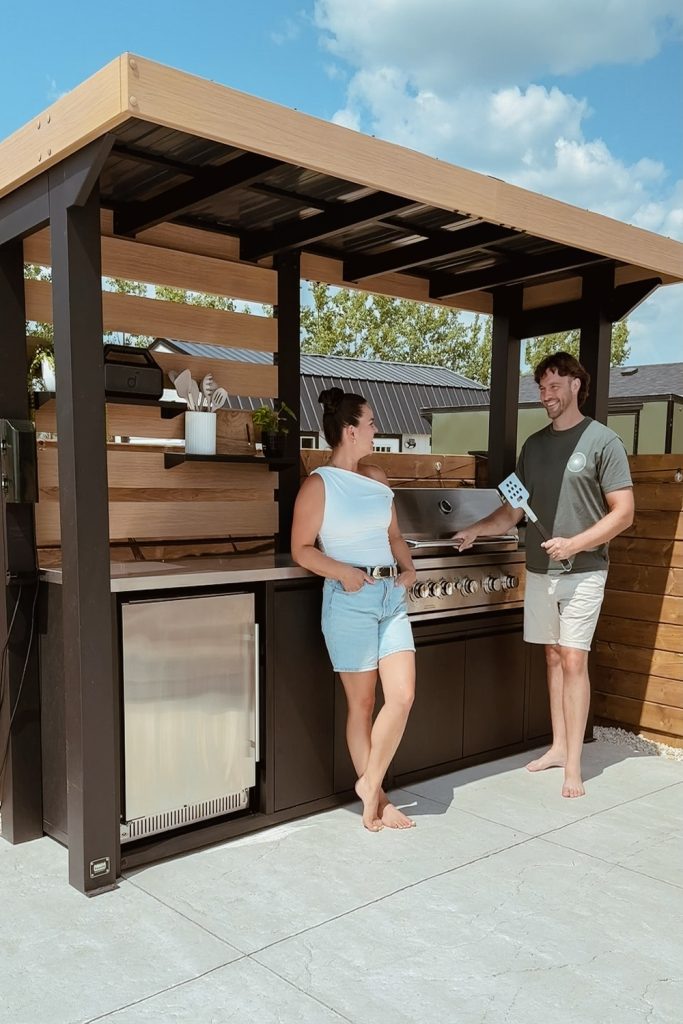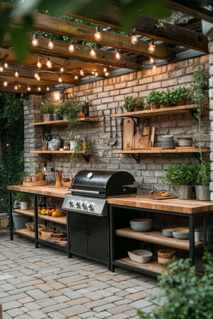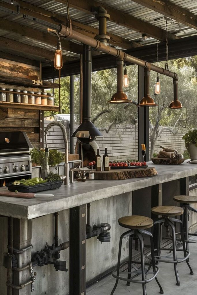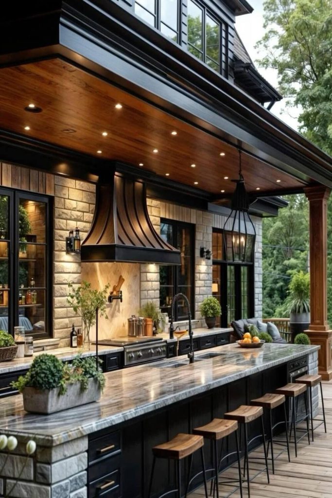 This outdoor kitchen is industrial and cool. Black metal frames and concrete surfaces give it a strong look. Wood accents make it softer. The grill and bar are great for hosting. Matte black fixtures follow 2025 trends. It works well in modern backyards. Mix metals and wood for balance. Share your edgy ideas below!