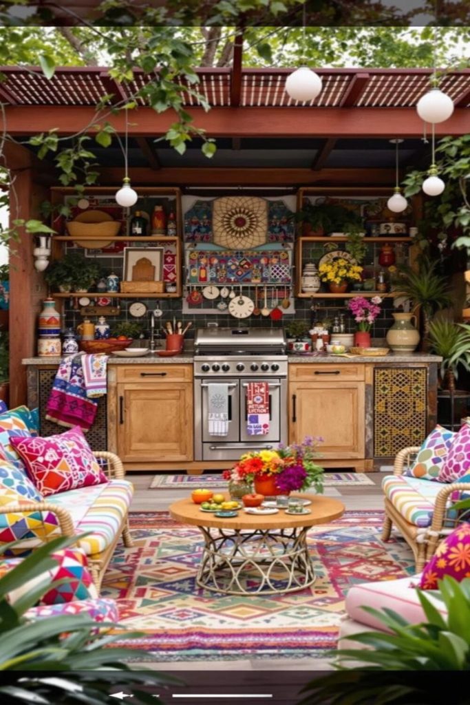 This boho-chic kitchen has lots of personality! Woven stools and macramé walls feel relaxed. Terracotta tiles and potted plants are eco-friendly. Mismatched dishes add playfulness. Perfect for small dinner parties, it feels like home. Layer textures and natural items to copy this look. Share your boho tips below!
