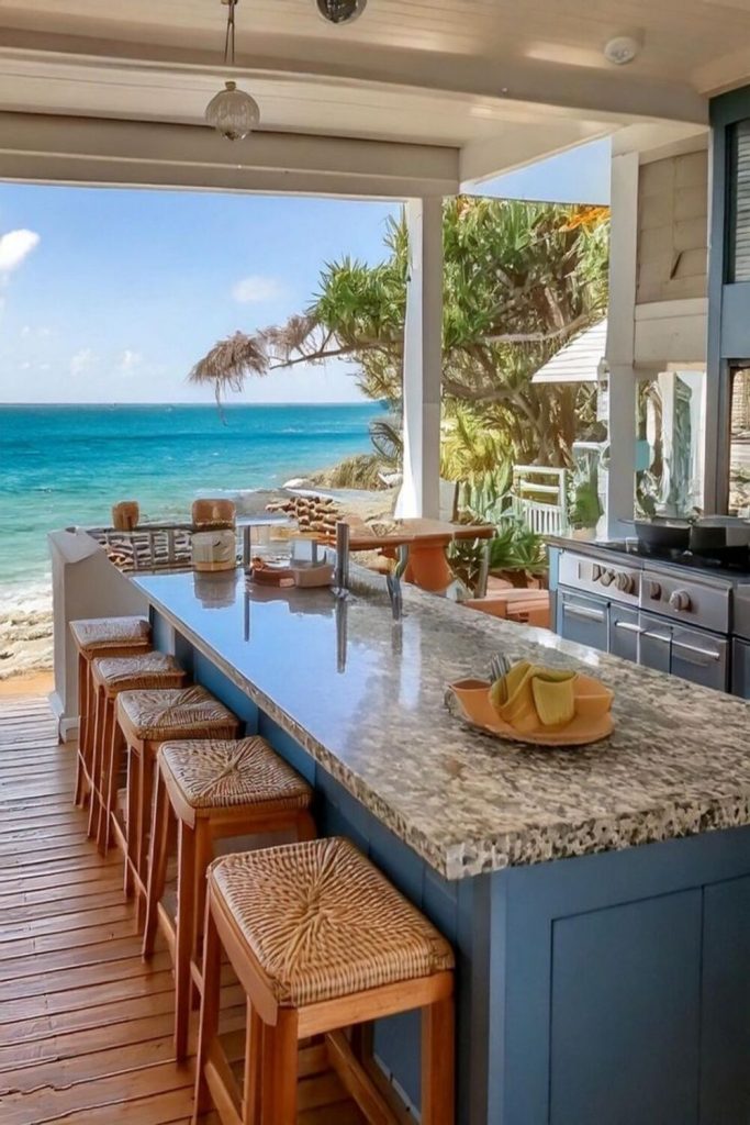 This coastal kitchen feels like the beach! Whitewashed wood and navy blue give it a seaside feel. The stone countertop is strong. Rope-wrapped stools add nautical charm. Open space works for summer pool parties. Use weathered textures and soft cool tones to get this look. Pin this for ideas and share your coastal tips!