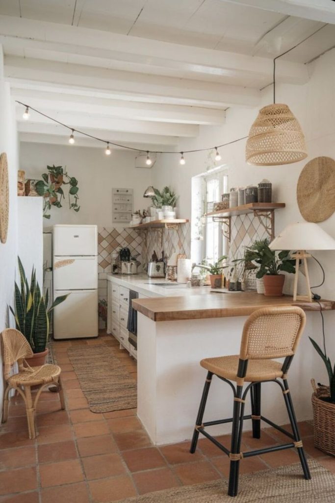 This boho minimalist kitchen is relaxed! Neutral wood and woven accents feel calm. Clean lines keep it modern. Potted cacti add charm. Perfect for small starry nights. Want this boho look? Layer textures and soft colors. Share ideas below!