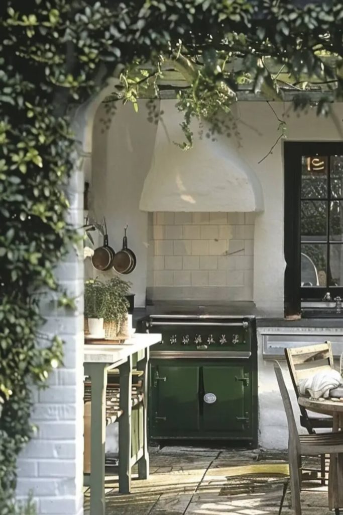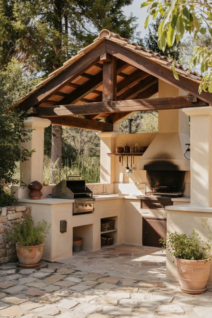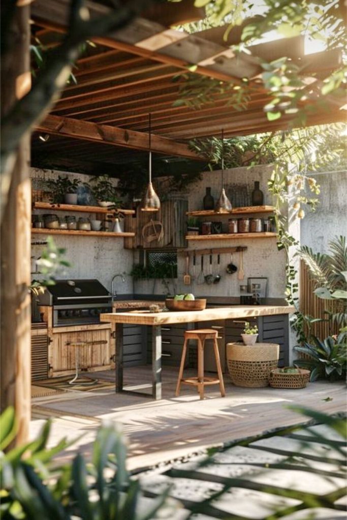 This rustic modern kitchen mixes raw and refined! Reclaimed wood and black appliances create contrast. Terracotta adds warmth. Pergolas with vines add nature. Perfect for barbecues. Want this look? Pair rustic textures with modern finishes. Pin this and share ideas below!