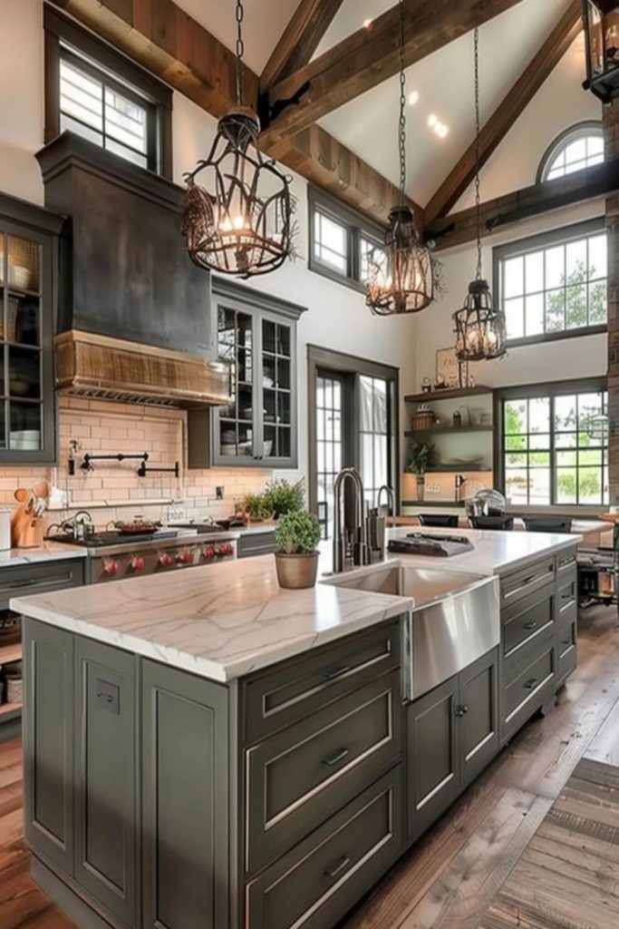 This modern farmhouse kitchen is cozy and chic! Shiplap walls and black metal look fresh. The wooden pergola adds warmth. Neutral colors with sage green pops match 2025 trends. Counters are big for family meals. Want this style? Mix classic and modern elements. Pin this and share ideas below!