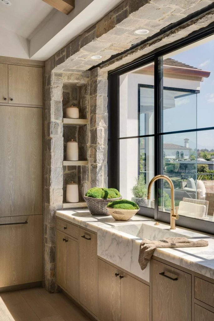This Mediterranean kitchen is sunny and warm! White walls and terracotta tiles feel inviting. Wrought iron adds charm. The pizza oven is great for summer meals. Earthy colors are trendy in 2025. Imagine drinking wine under a pergola here! Want this look? Use rustic textures and warm colors. Share tips below!
