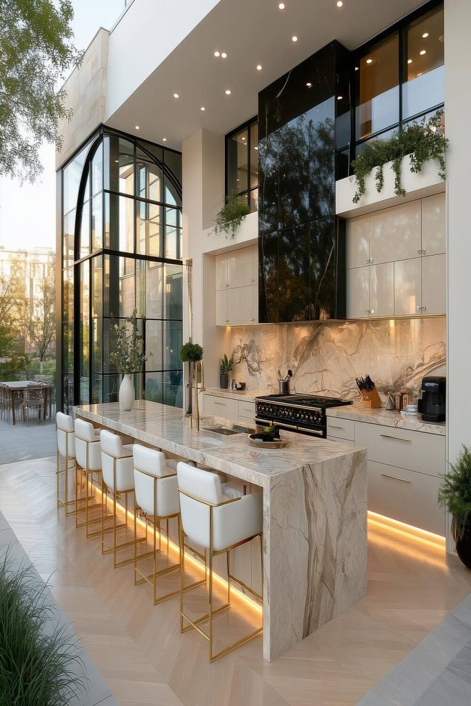 This classic Mediterranean kitchen feels like Tuscany! Stucco walls and terracotta tiles are warm. Wrought iron stools add elegance. Grill and stone oven are great for pizza nights. Earthy tones fit 2025 trends. Want this look? Use rustic materials and warm colors. Pin this and share ideas below!