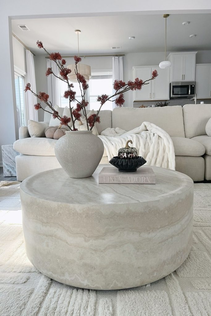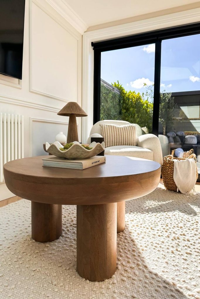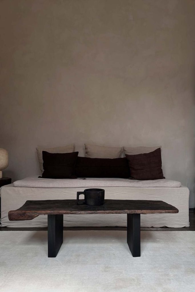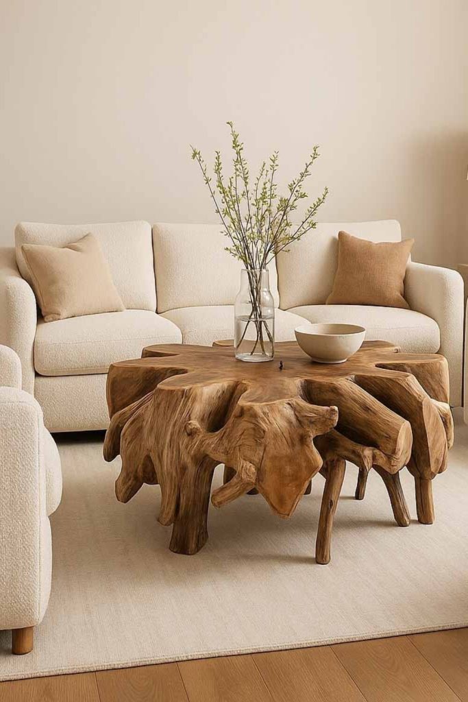 Left outside intentionally for that perfect silver-gray patina, then brought in and sealed. Paired with creamy boucle chairs, it’s the ultimate modern organic moment we’re seeing everywhere in 2025. Nature did half the work here.