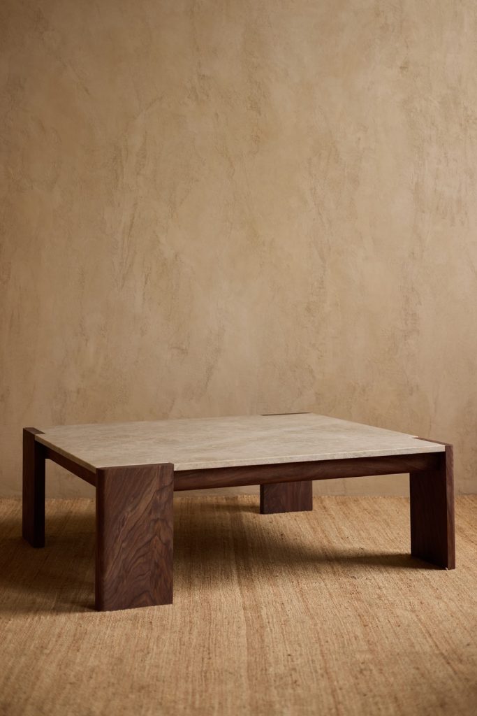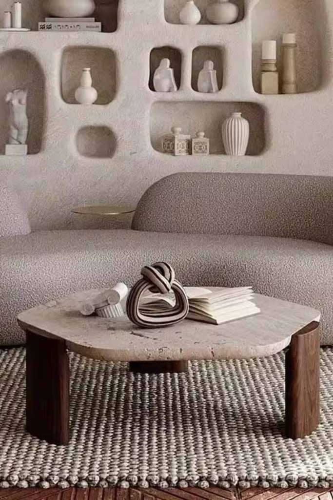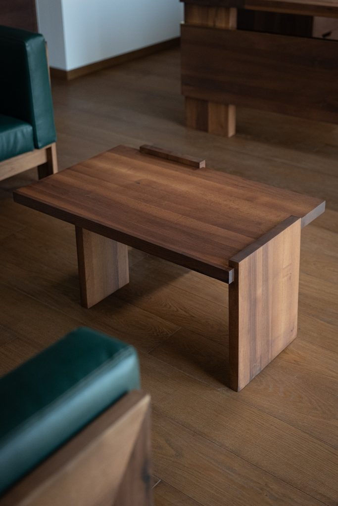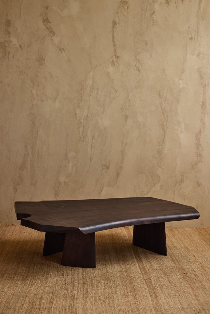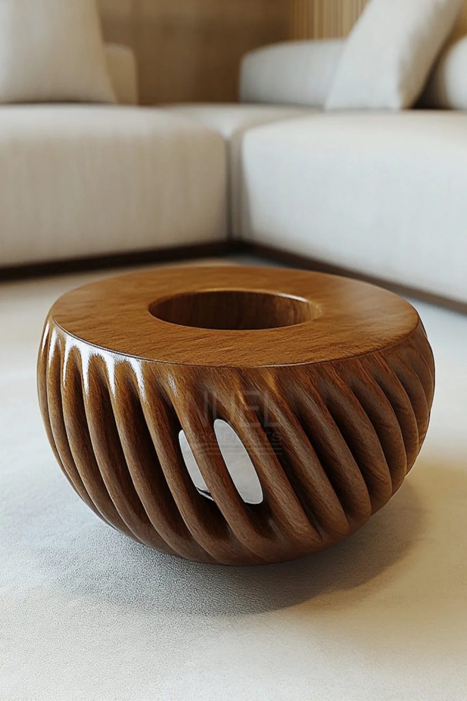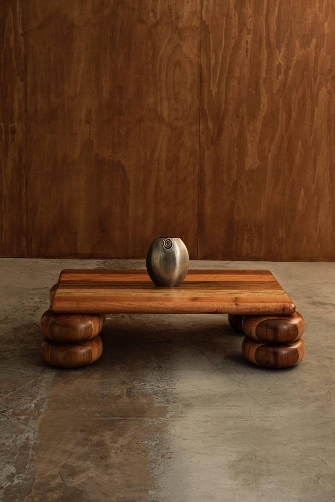 Do you like sitting on the floor? This low wood table is stained a warm gold color. It is the best. Add soft rugs, floor seats, and many plants. It means: chill nights with friends. They just put two wood stacks on top. They fixed them tight. They put soft pads on the base. No legs, no stress, just cool times.