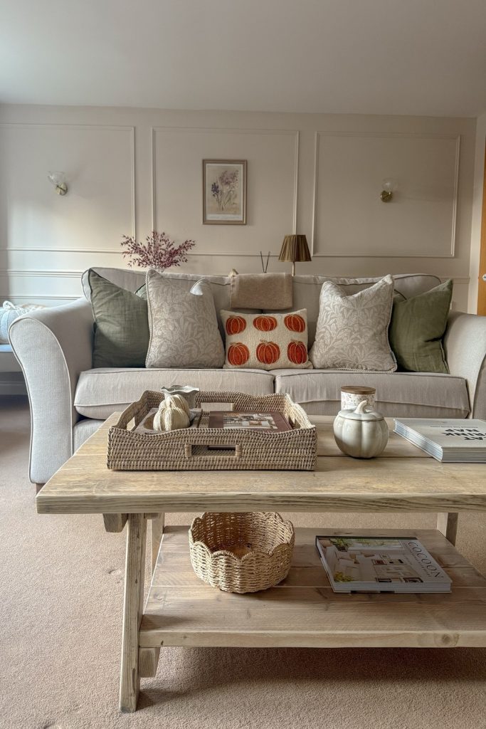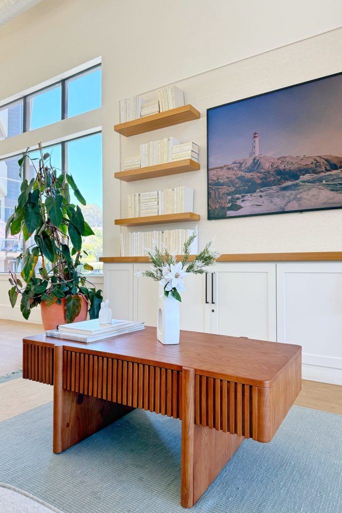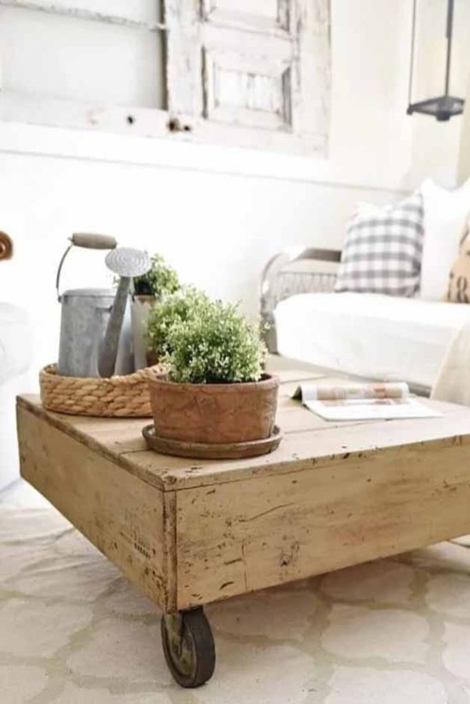 This soft, white paint finish feels like a house by the sea. This is true even if you live far from the sea. They kept the wood gaps for a rough feel. They put on big wheels. This is smart to move the table on a movie night. They used cups and trays to style it. Now your room feels like salt air and cloth. I did this look myself. Use two coats of thin white paint. A quick rub with sand paper is all you need.