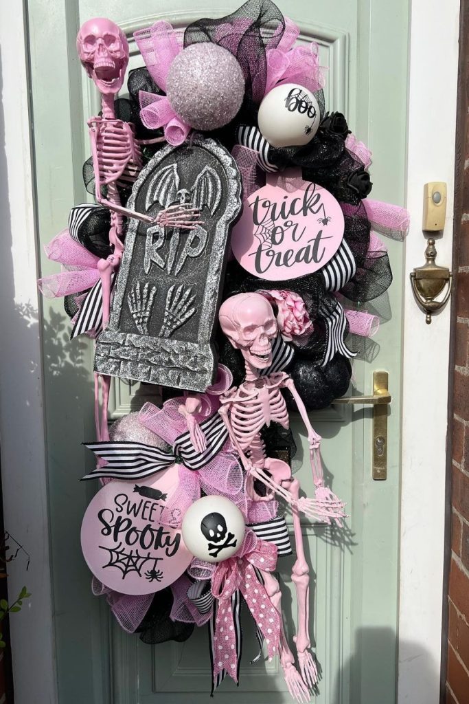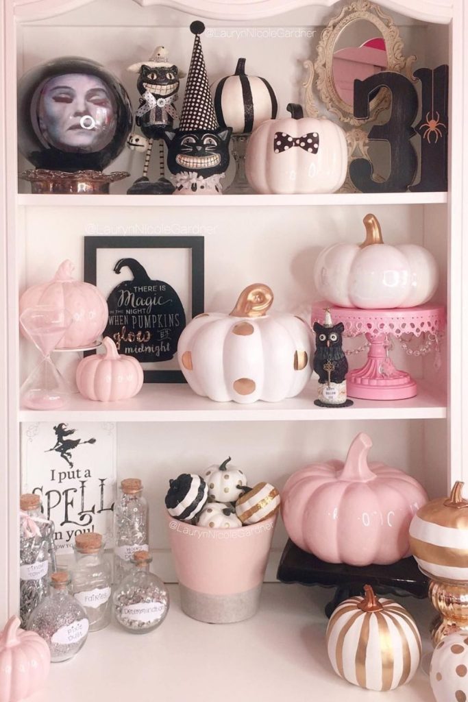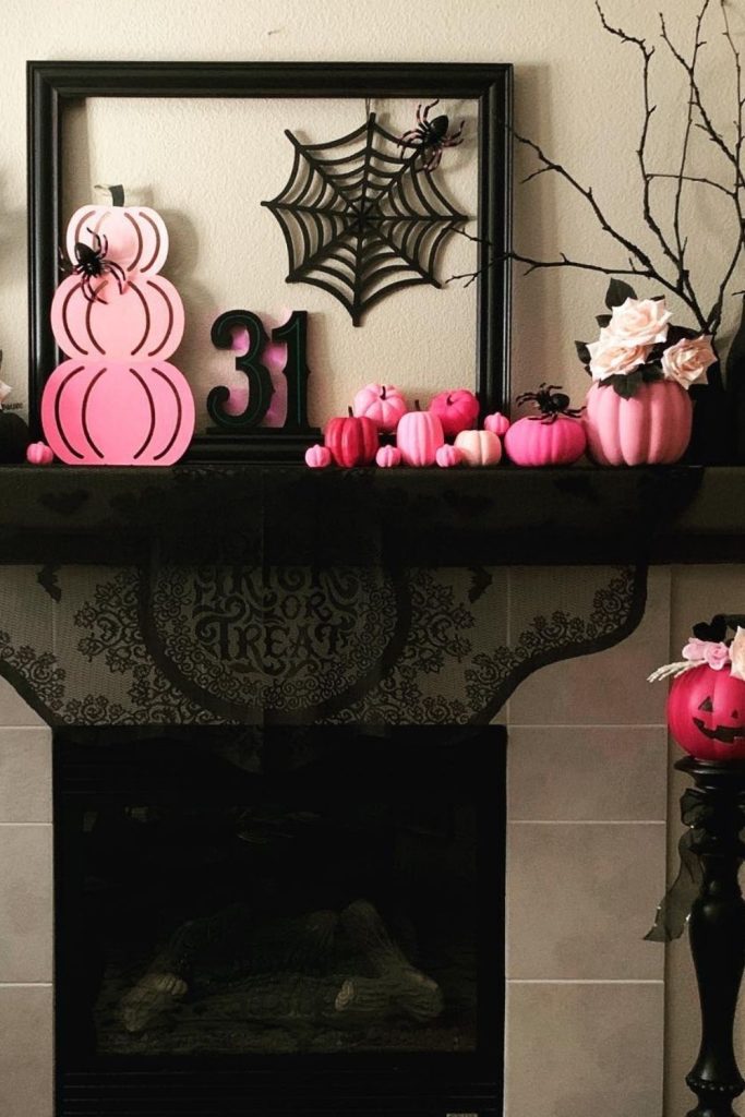 This shelf setup shows minimalist pink Halloween decor. A few blush pumpkins and a black vase keep it simple but festive. The wooden shelf is eco-friendly and warm. It fits 2025’s green trends. It works well in small spaces or for a soft spooky vibe. Add a tiny skull for extra charm. Want to style a shelf for Halloween? Pin this idea. Share your minimalist tips in the comments. Let’s keep it spooky yet stylish together.