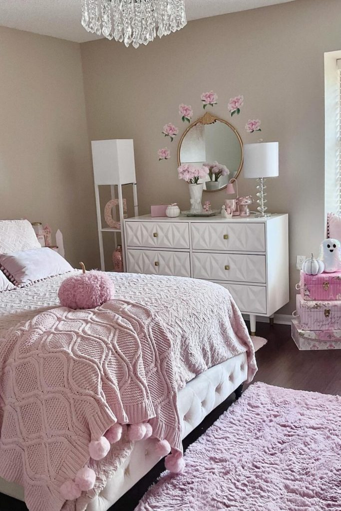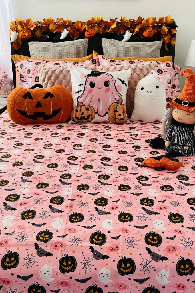 This bedroom is cozy for Halloween. Blush pillows and a pink quilt sit with mini pumpkins. Linen curtains add texture. Add a scented candle for warmth. It’s spooky yet calm. Pin it and share your bedroom decor ideas!
