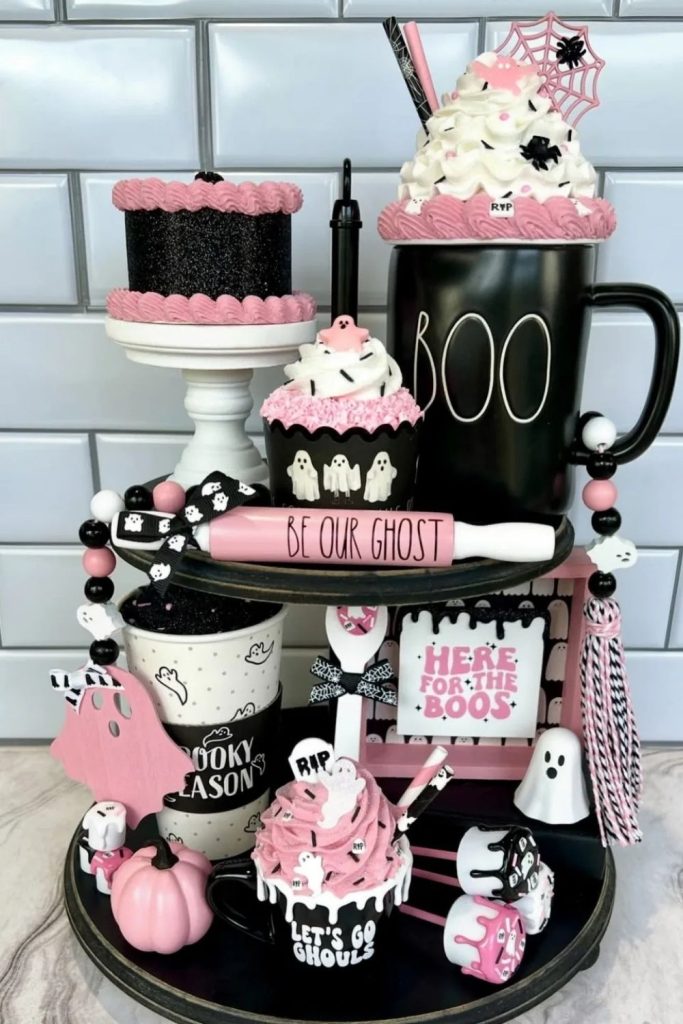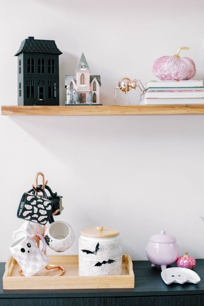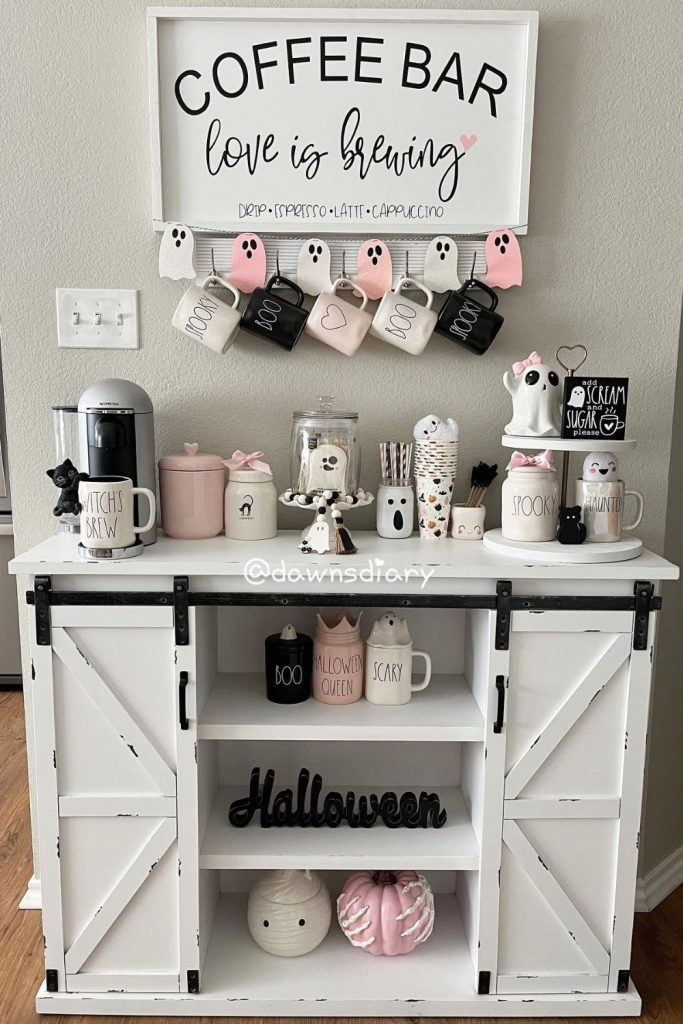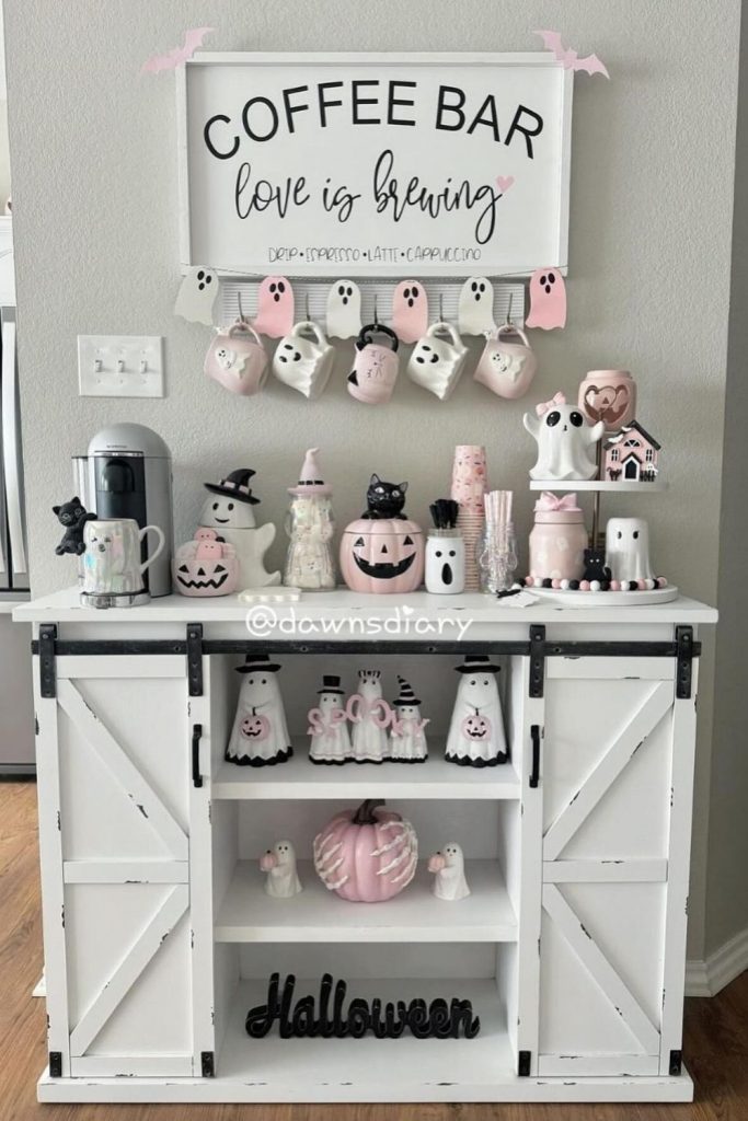 This kitchen nook is pink and fun. Blush mugs, pastel pumpkin coasters, and a woven mat look cute. A wooden tray adds warmth. It’s perfect for pumpkin spice drinks. Pin it and share your pink Halloween tips!