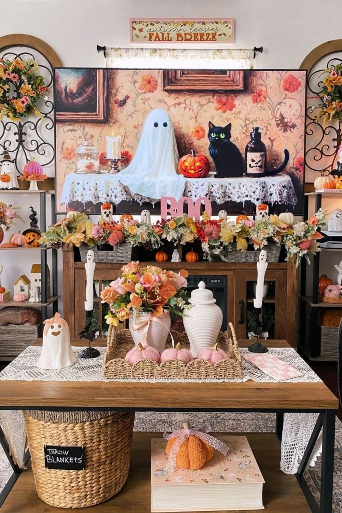 This coffee table shows pink Halloween charm. Blush coasters, a pastel pumpkin tray, and a recycled glass candle holder make it cozy and festive. A soft pink throw adds warmth. It fits 2025’s cozy minimalist trend. It is great for reading a spooky book. Want to refresh your coffee table? Pin this idea. Share your styling tips below. Let’s make a chic and spooky living room together.