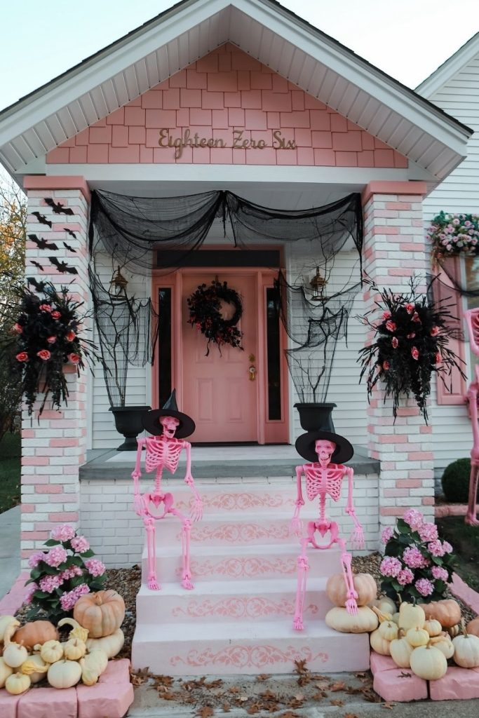 This patio shows pink Halloween decor outside. Blush lanterns, pastel pumpkins, and a woven rug make it festive and cozy. The wooden bench is eco-friendly and warm. It fits 2025 trends. It is perfect for sipping cider under the stars. Add a pink throw for extra comfort. Want to refresh your patio? Pin this idea. Share your outdoor tips below. Let’s make a spooky and inviting outdoor space.
