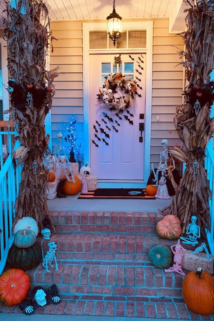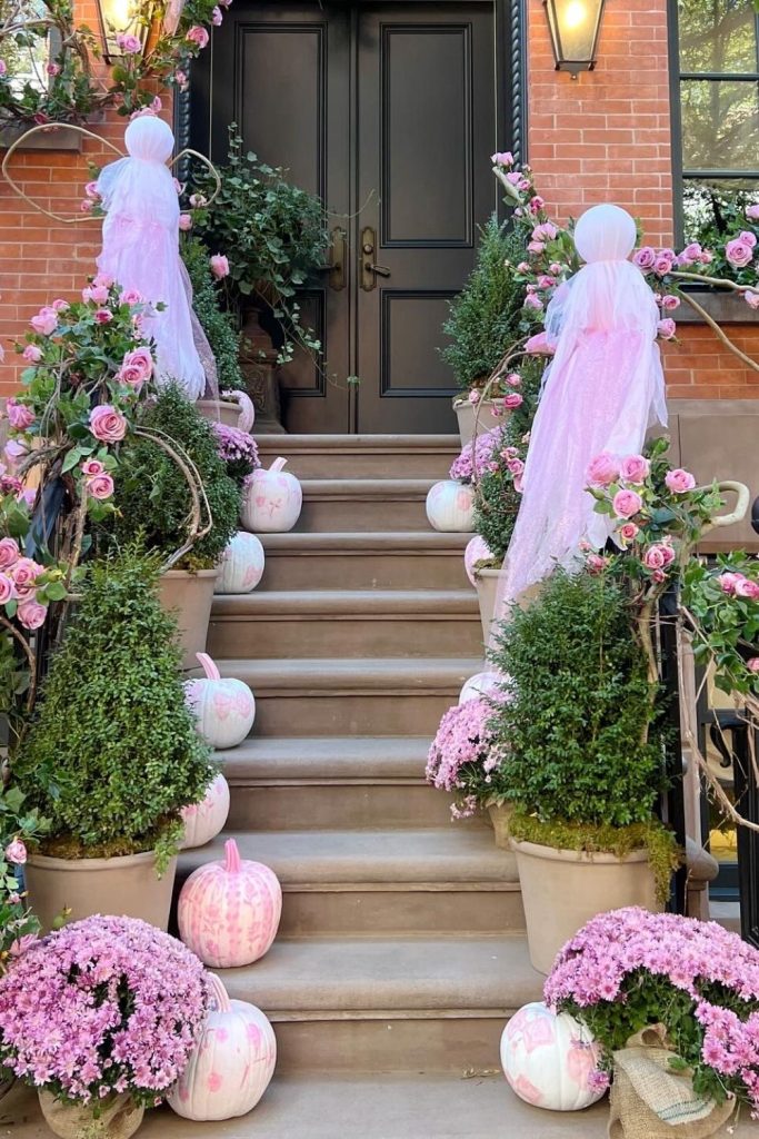 This porch is pink and welcoming. Soft pink lanterns and mini pumpkins line the steps. A woven mat adds a natural touch. Add a fluffy throw for chilly nights. This look is perfect for trick-or-treaters. Pin it and share your porch decor tips!