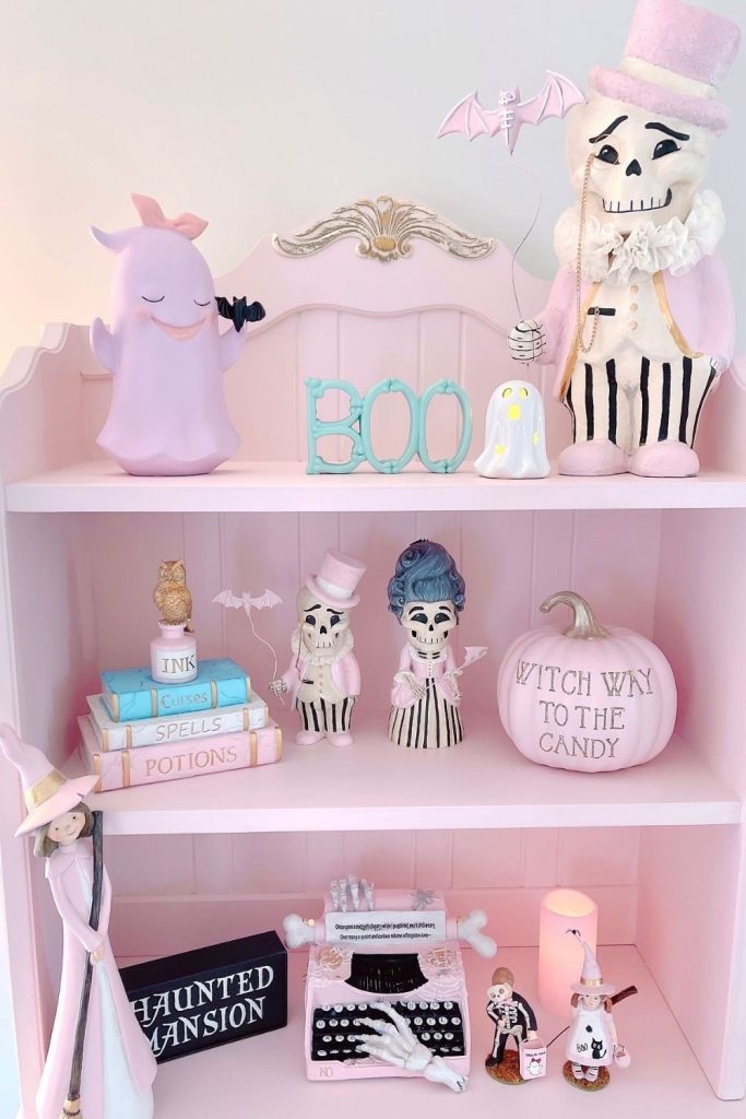 This wall display shows chic pink Halloween decor. Blush-framed spooky quotes and pastel skull prints look bold but cohesive. Wooden shelves add warmth and eco-friendly style for 2025. It is perfect for adding festive flair anywhere. Mix in candles for ambiance. Want a spooky wall display? Pin this idea. Share your art styling tips below. Let’s make your walls pop this season.