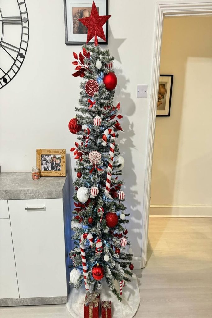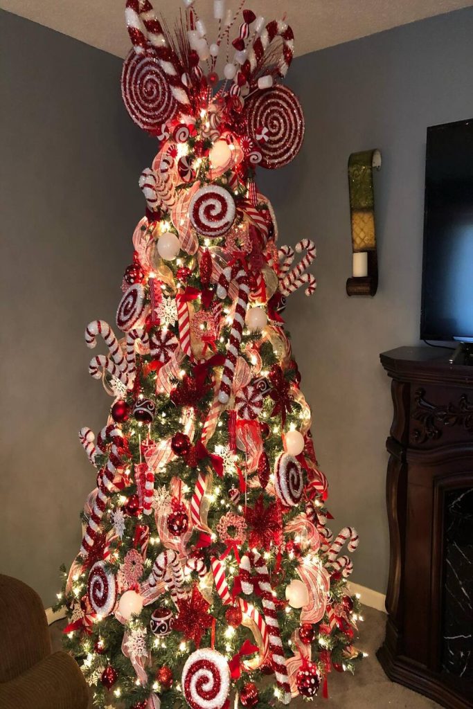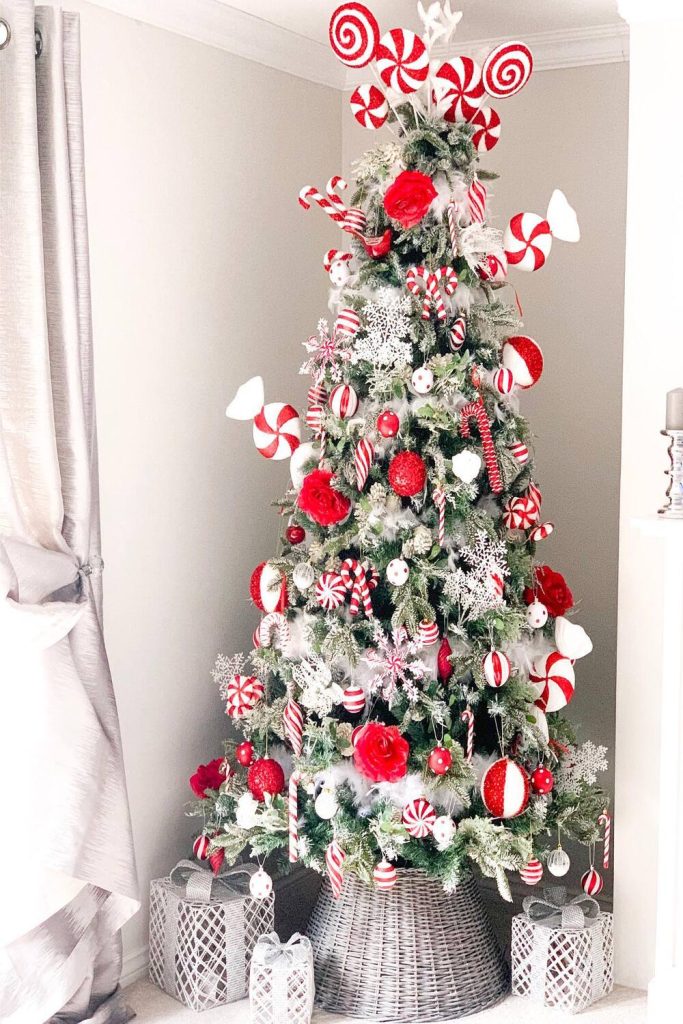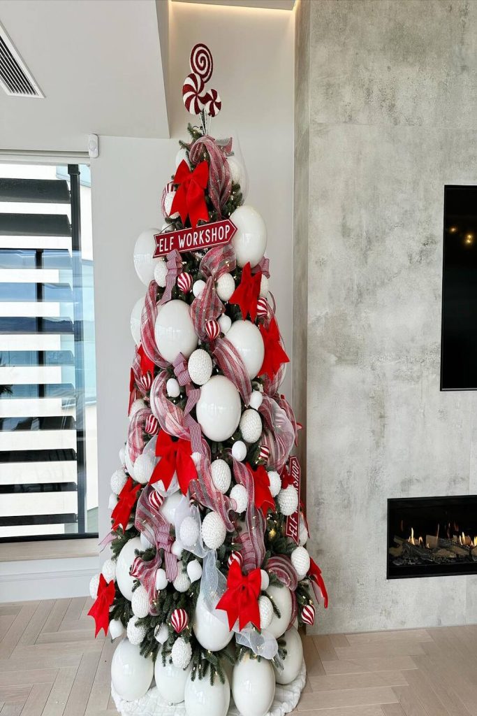 This red and white tree feels fun and bright. Candy cane stripes and soft pom-poms make it playful. Red balls shine next to white snowflakes for a sweet look. It’s kid-friendly but still stylish, great for family time. Try felt or fabric ornaments to keep it green. This tree is a joy to see! Want a fun setup? Save this idea and share your own quirky holiday style!
