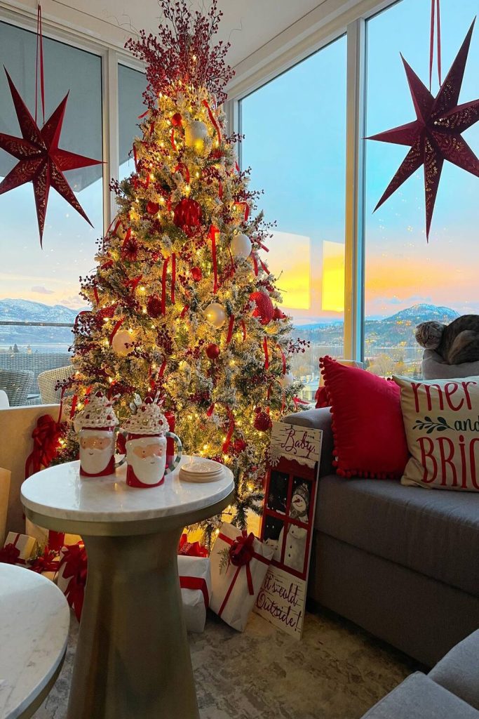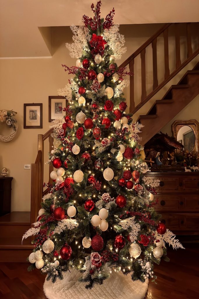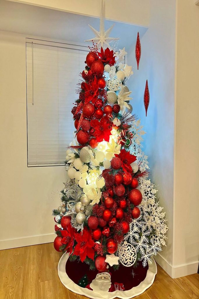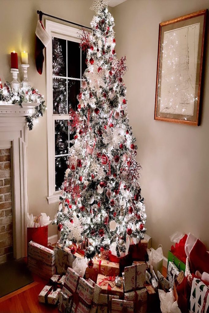 This red and white tree looks fresh and bright. Red balls pop on white branches. Soft lights make it warm and cozy. I love how it stays simple but still shines. It works well in small rooms or if you like a clean look. Add gold or silver for extra sparkle. This tree is perfect—save the idea and share how you’d style yours!