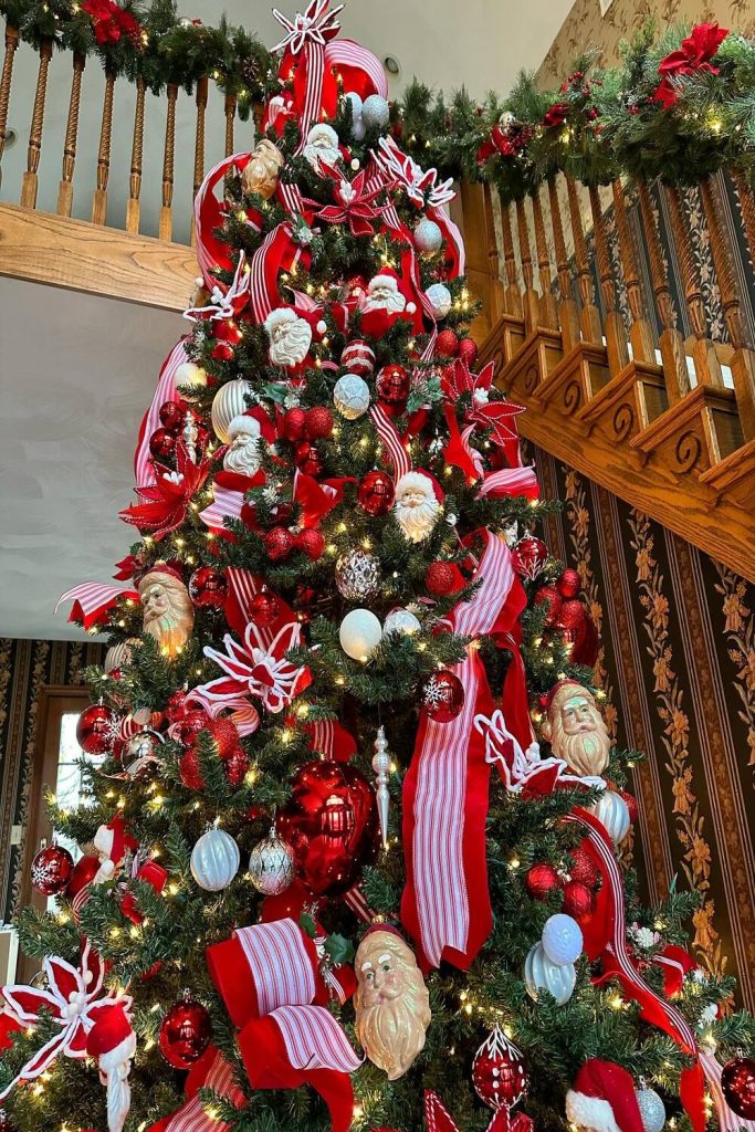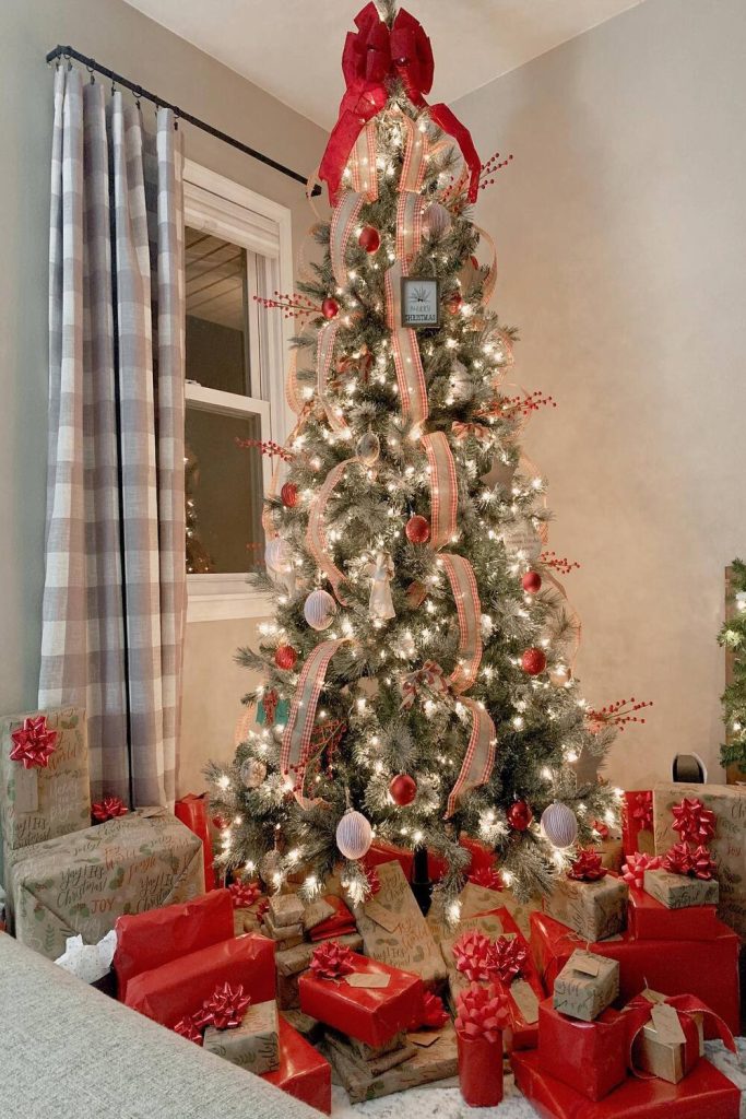 This red and white tree shines. Red balls sparkle. White ribbons look soft. Warm lights make it bright. Metal pieces add shine. I love how it uses green, reusable decor. Want more sparkle? Add more metal pieces. Pin this and share your ideas. Let’s make a pretty holiday tree!