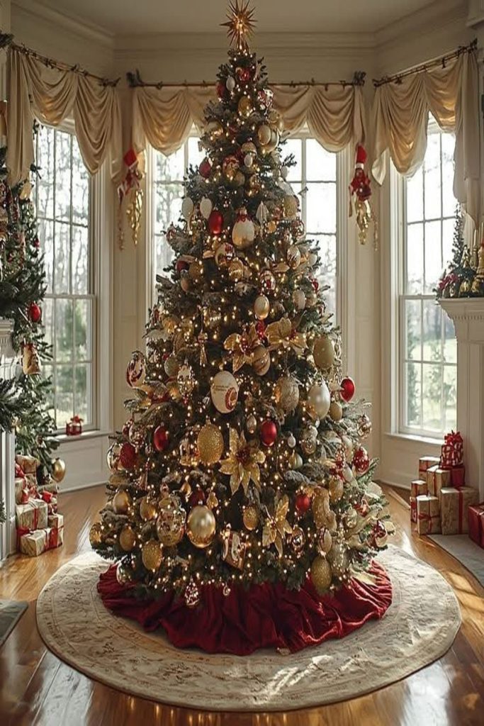 This red and white tree feels bright and chic. Shiny red balls sparkle with soft white ribbons. Gold adds a rich touch, great for a fancy party. I like mixing satin and velvet for a luxe look. This style shows you can keep it festive and still be elegant. Want to dress up your tree? Add shiny metal or extra ribbons. Save this look and share your best holiday tips in the comments!