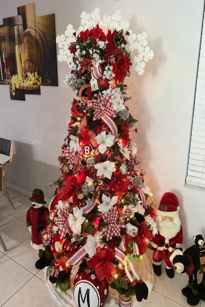 This red and white tree looks bright and bold. Shiny red balls stand out on crisp white trim. Big bows and soft lights make it shine like a star. This tree brings color and joy to any room. Love a bold look? This style is for you. Want more depth? Mix matte and shiny ornaments. Save this idea and tell in the comments how you’d make it your own!