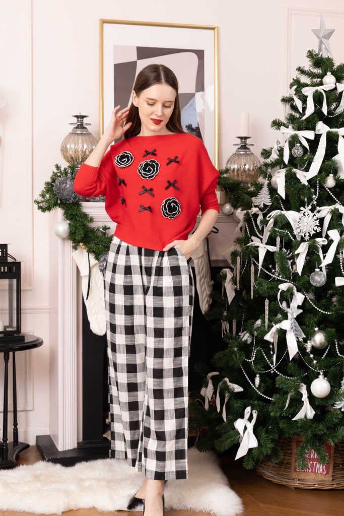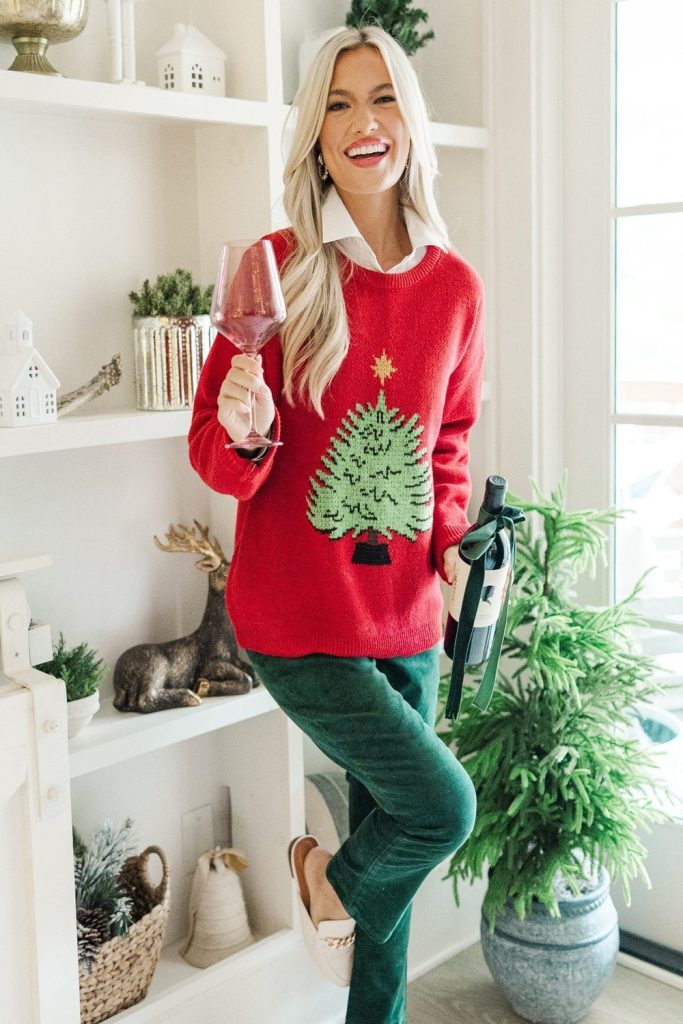 This red sequin top sparkles with holiday cheer! Wear it with black pants for a shiny, fun Christmas look. The sequins catch the light and make you stand out, matching 2025’s glam trend. I love how it looks with small earrings for balance. It’s perfect for dancing or parties! Ready to shine bright? Pin this for your holiday outfit ideas and share your favorite sparkly look below. Let’s sleigh this season!