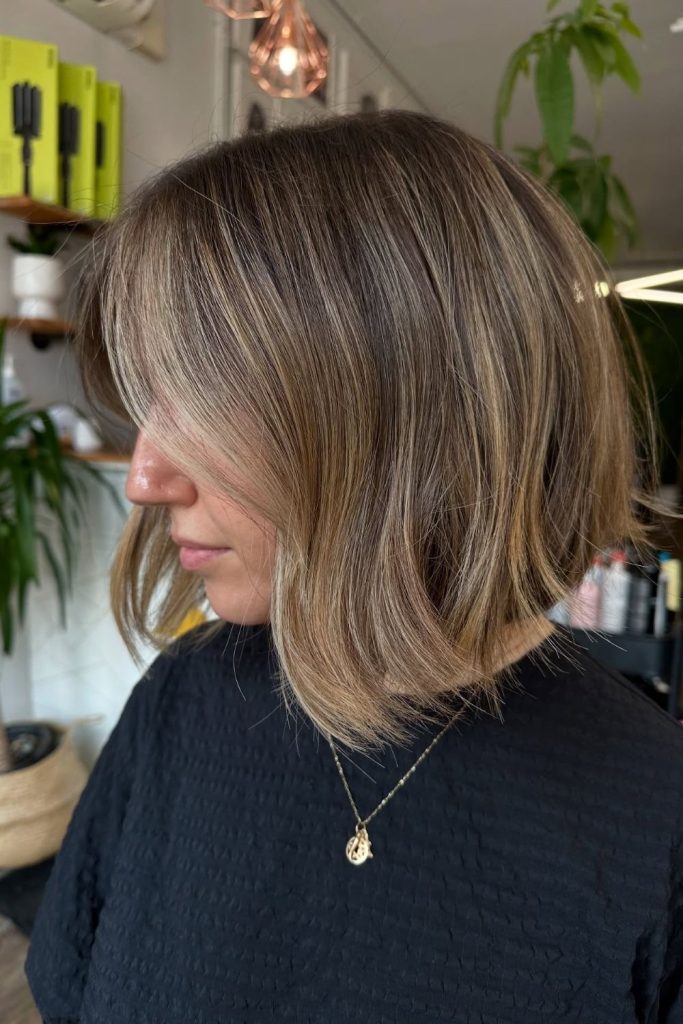 “This layered bob adds light volume and soft movement to your hair. The gentle layers suit fine or medium hair types. It looks great on round and oval faces. I wore it to the beach, and it stayed in place all day. Blow-dry and use mousse for extra lift. This cute bob look is trending on Pinterest. Save it, take it to your salon, and show off your new style!”