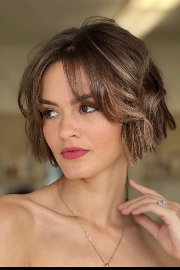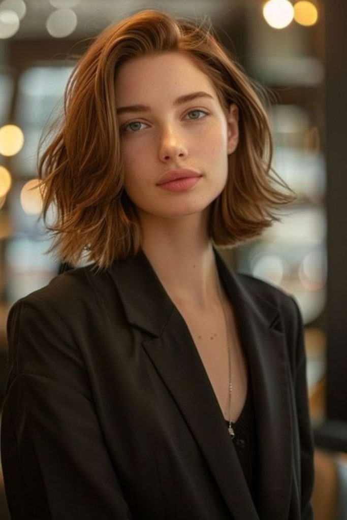 The wavy bob is carefree, easy, and full of charm. Loose waves add soft shape and lift, making round and oval faces glow with balance and style. I wore this look to brunch with friends—it felt light and fun. It works great on thick or medium hair and suits many types. Use a curling wand and light spray to shape natural waves. Want a relaxed cut that still looks trendy? Try this short bob and love the effortless look!