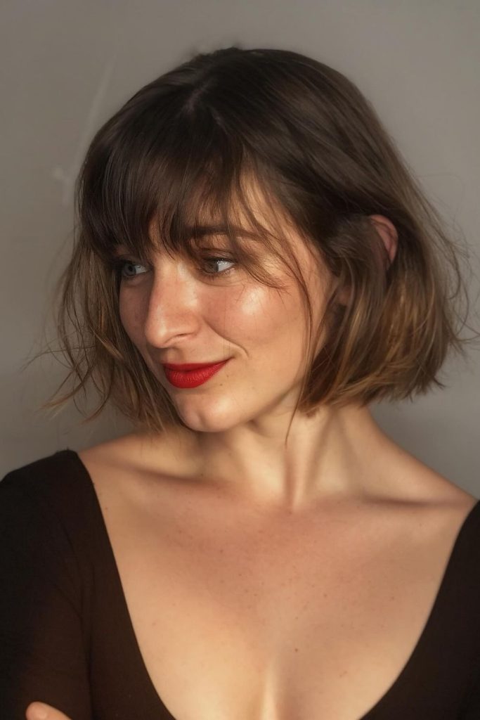 “This short bob with soft bangs feels cute and fresh. It works well with straight or curly hair. It looks great on oval and heart-shaped faces. I wore it to a friend’s wedding party, and it looked lovely. Use a round brush to shape the bangs. Leave your hair smooth or a little messy. This style for 2025 is all about softness. Try it and tell me how it feels!”