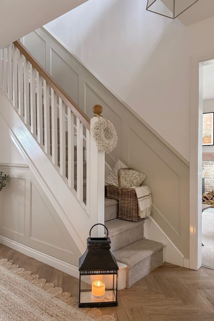 These corner stairs are great for small homes! They fit into a nook and have shelves for plants or decor. The soft oak wood adds warmth and fits the cozy fall style. A jute runner adds texture and makes each step soft and nice. I love how these stairs turn empty space into something special. Add candles or books to show your style. What’s your best space-saving idea? Share it below and save this for later!