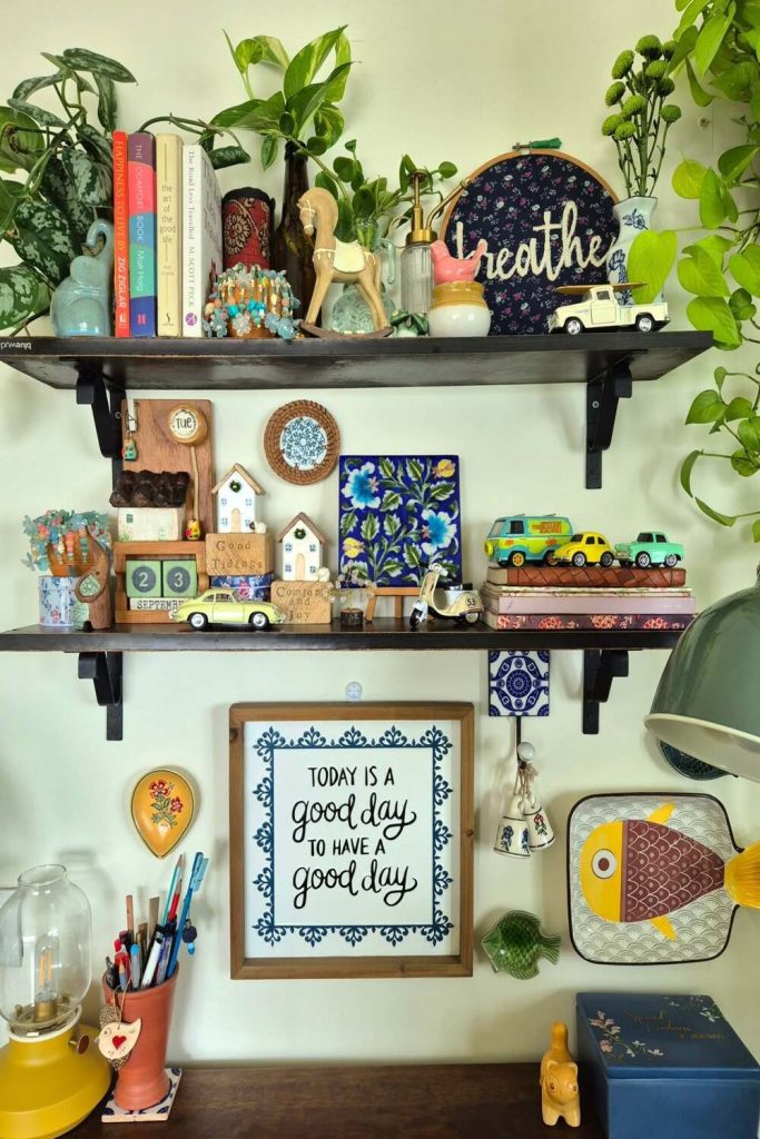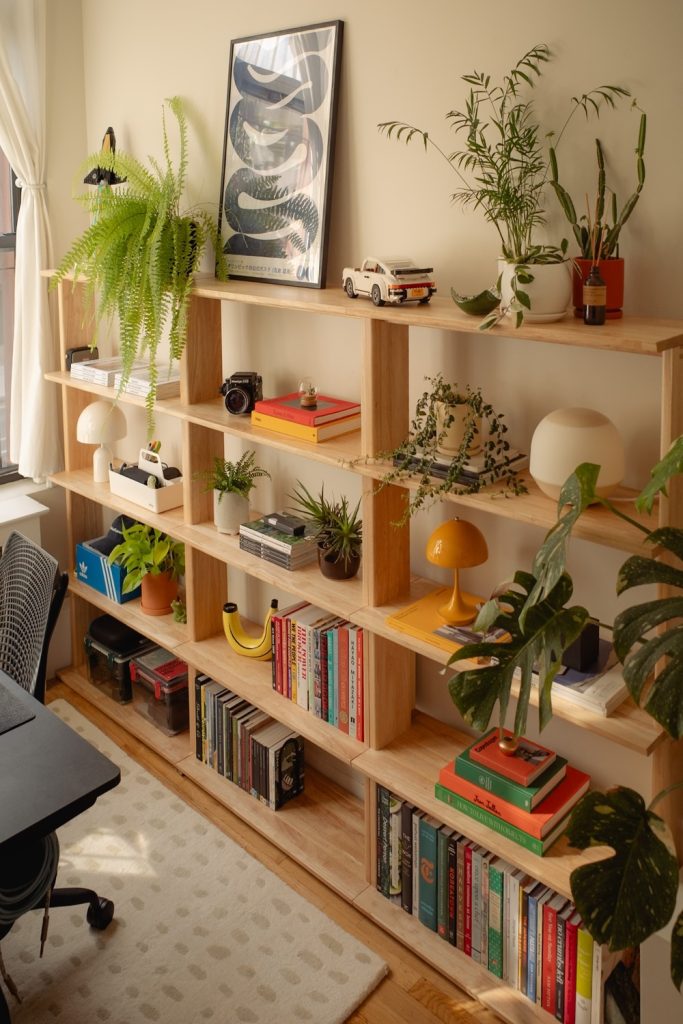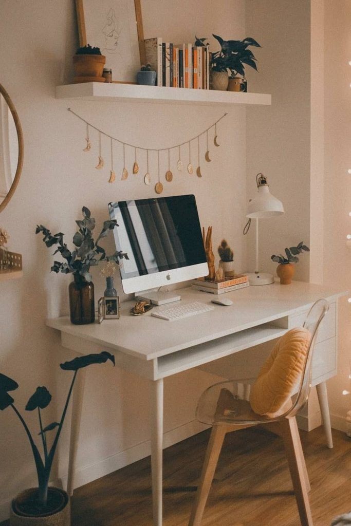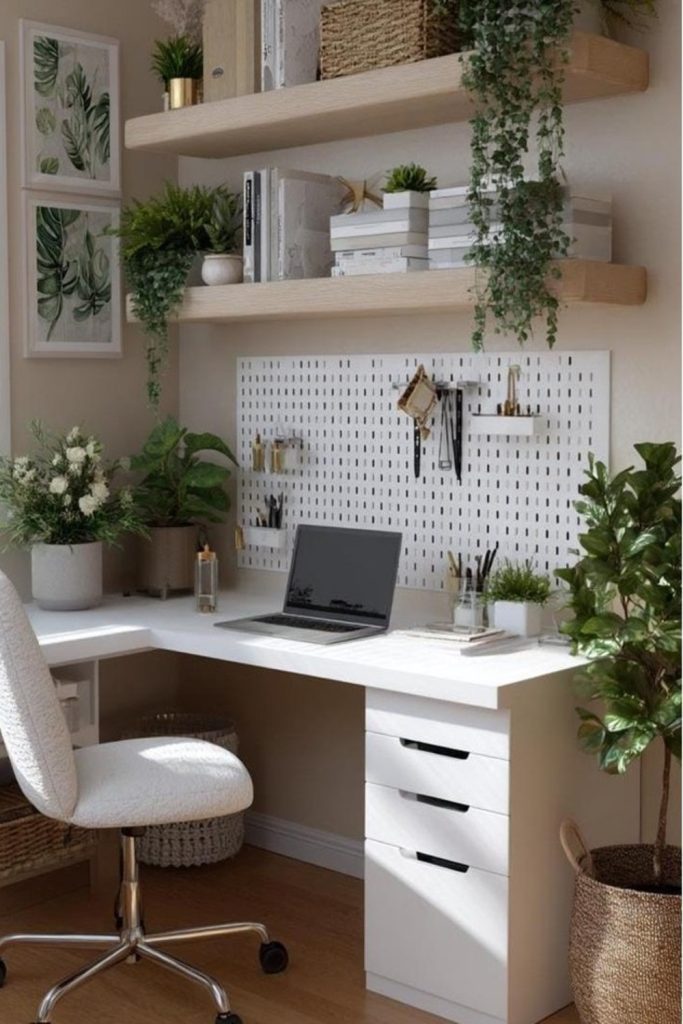 If you love plants, this is for you. Use plants of different heights. Put one on a high ledge. Put one on the floor. This creates a “wild” feel. Plants clean the air. They boost your mood. Use clay pots for a natural look. It breaks up the gray desk feel.
