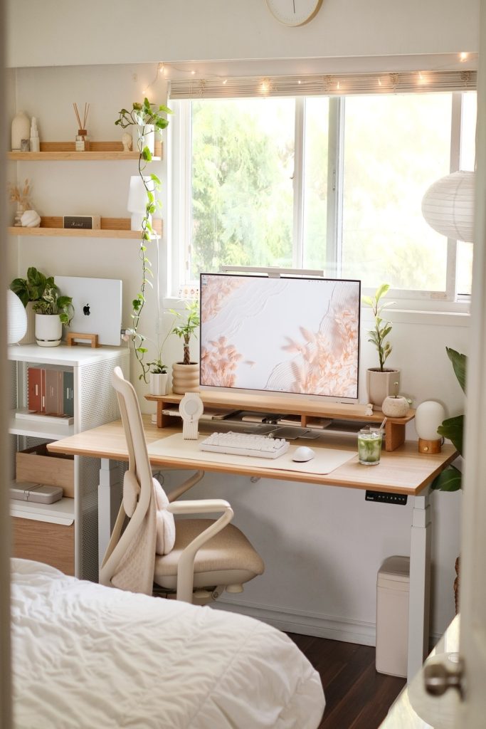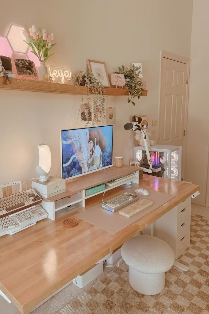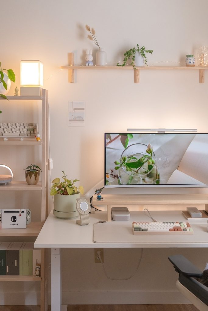 This highlights the beauty of transparency and natural wood. Glass storage jars filled with colorful spring-themed stationery (think pastel paperclips and floral washi tape) act as decor themselves. The monitor is elevated on a beautiful oak stand, providing space underneath for a small succulent tray. This is desk organization done right—functional storage that doubles as a seasonal display. It’s a very “clean” look that prioritizes high-quality materials over quantity, fitting the cozy minimalism trend perfectly.