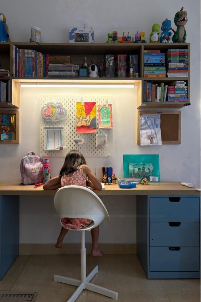 Work tools do not have to be dull. This plan uses soft green and pink. A cloth board lets you pin up art or cards. I love to add a small lamp. It looks like soft sun. It makes a small stall feel like a nice room. Colors really do help you focus.