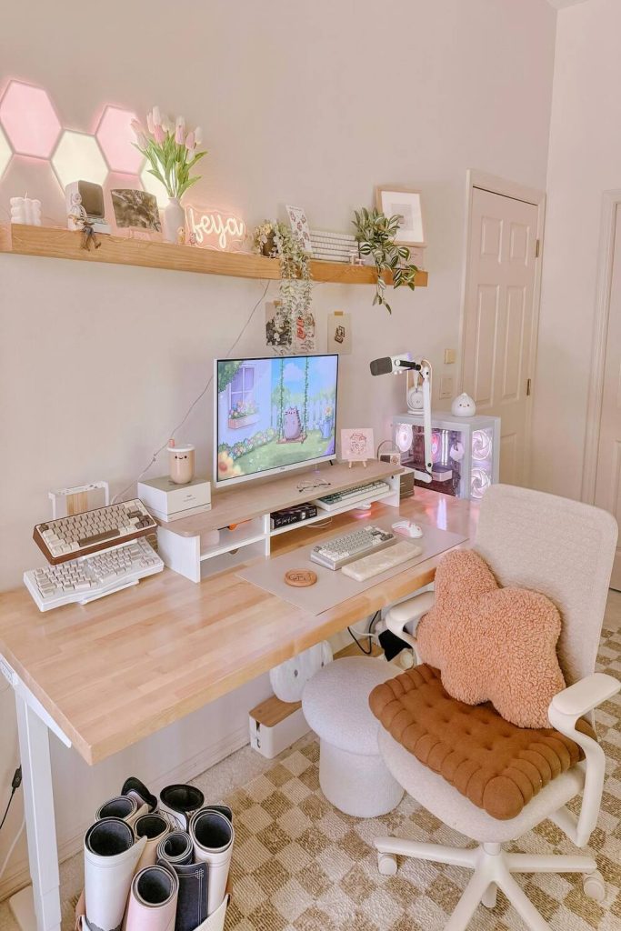 This look is clean and rich. Use real things like a light wood stand. A cork mat feels warm and firm. For spring, add one clay pot with a green leaf. It is not messy. But it looks smart. If your desk is small, use a tall shelf. This keeps your gear from taking up room. It is calm for busy days.