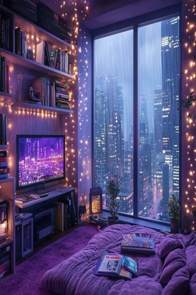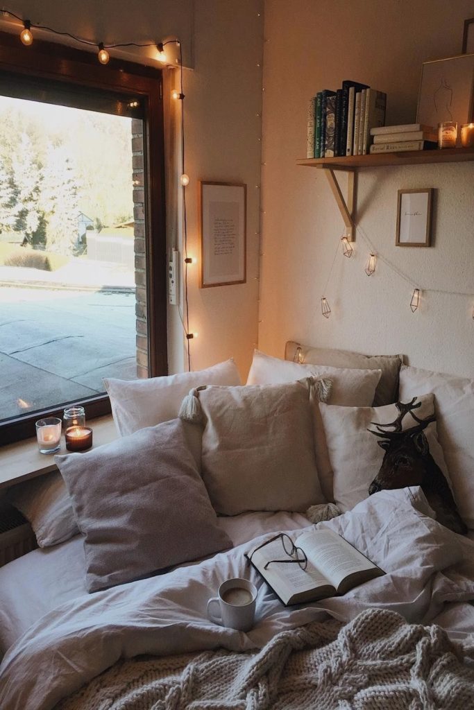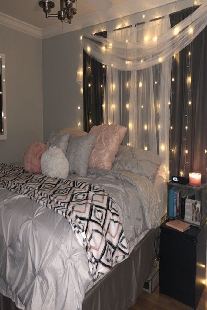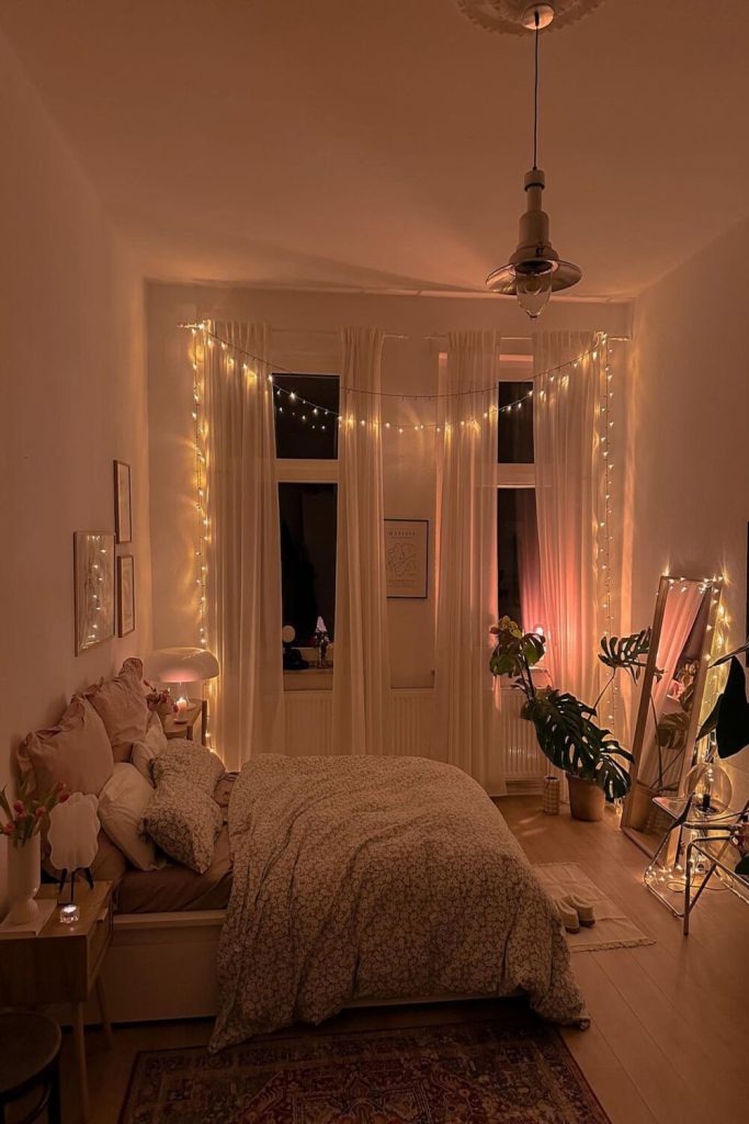 Warm lights are next to white curtains. They make the light very soft. Your bed floats in a cloud. I did this last winter. I love it and will keep it up. The light shines all over. It hides the wires. A small room feels romantic. Use small tacks or hooks. Put them on the ceiling edge. Let the curtains fall down. Done! This is a fast, dream room fix. It looks like magic in photos.