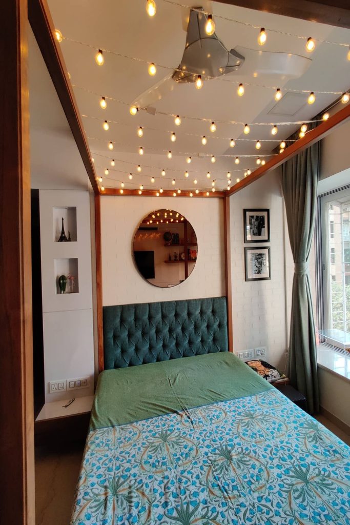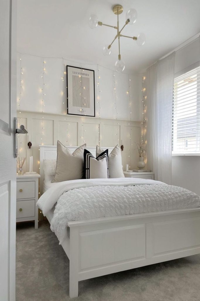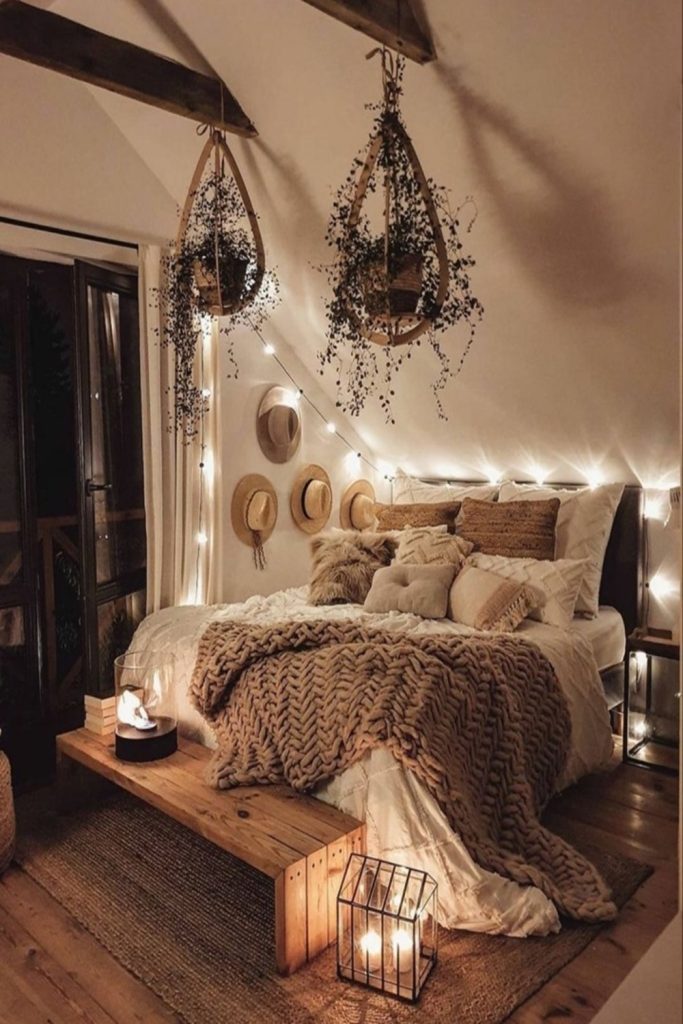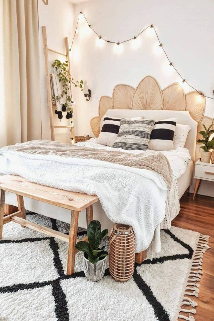 One light strand hangs over a woven bed frame. It falls onto the side tables. It is simple but cool. I use this style for small budgets. It always looks good. No clips, no fuss. Just pure, calm style. It works with all styles. This shows that a simple plan can look the prettiest.