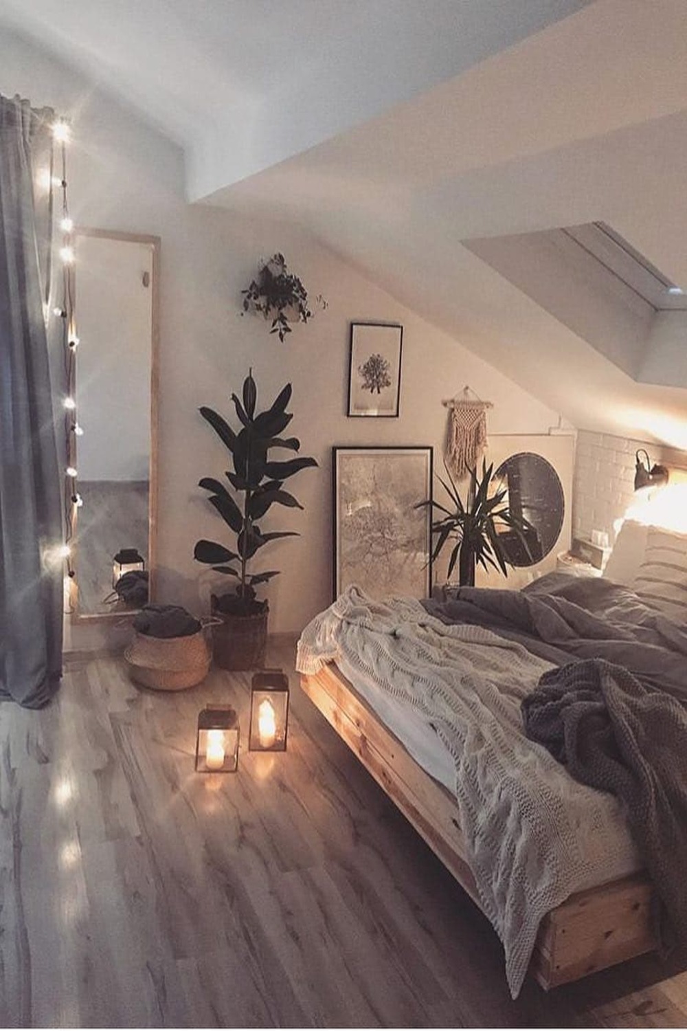 Thin copper lights are put in a metal bed frame. This makes a small sparkle. You can barely see them in the day. They are pure magic at night. I use copper wire now. It is easy to hide. This look is simple but cozy. This is perfect if you like a soft glow.