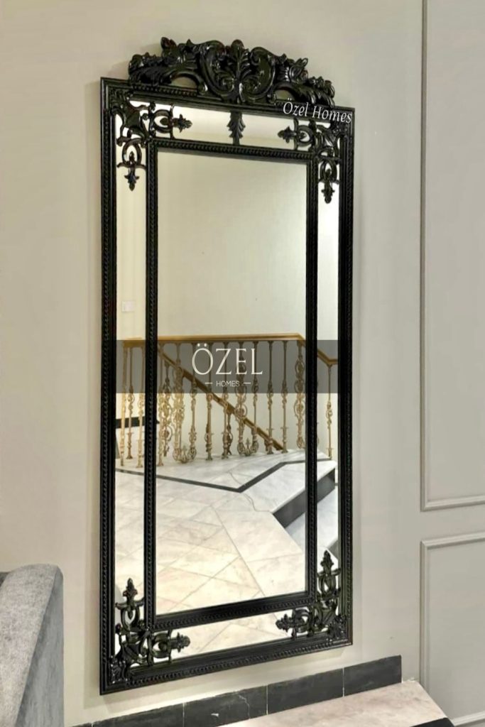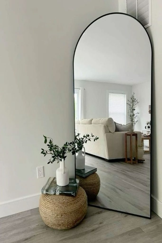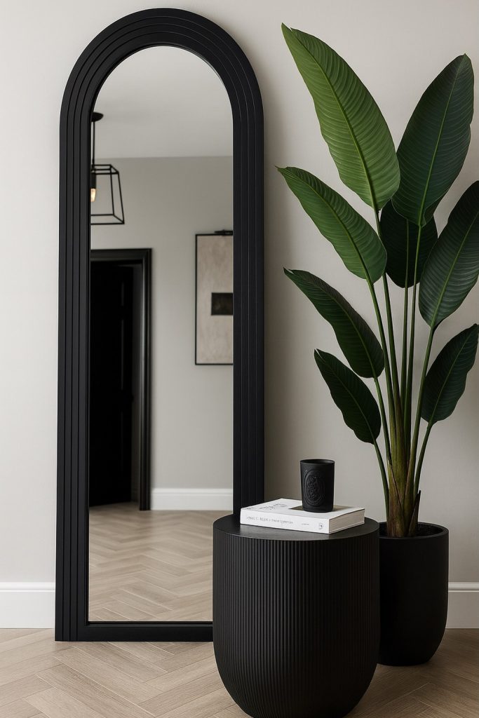 This tall black curved mirror stands next to a dark wood table. This look is very bold. A basket, some books, and one glass jar keep the look soft. It is simple and not too hard. I like how the mirror shows the hanging light. It makes the entry seem twice as grand right away. It is best for halls that need height but no extra size.
