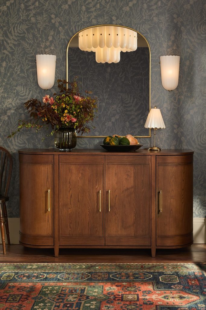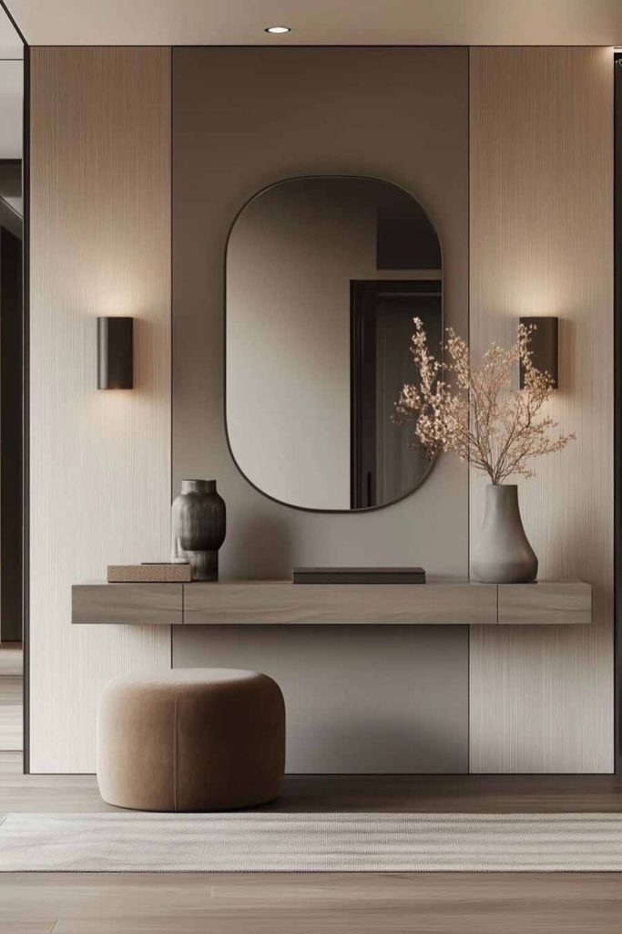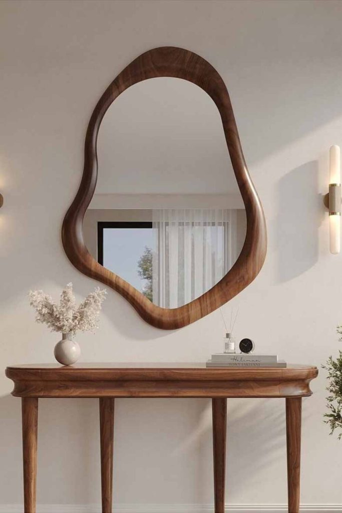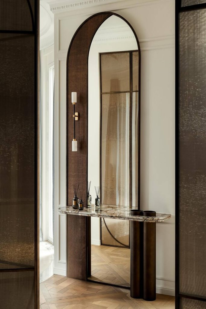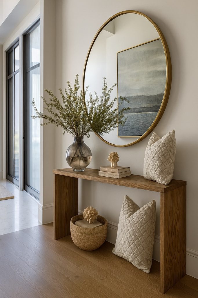 1. Oversized Arched Mirror + Warm Wood Console Magic