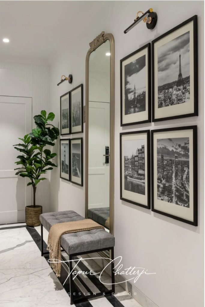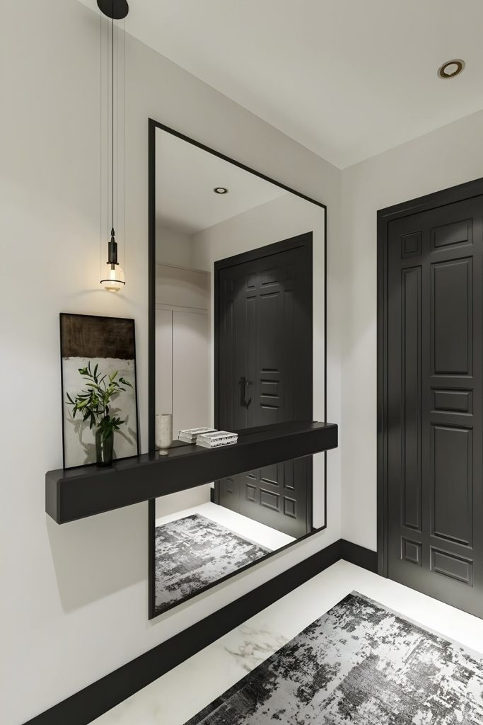 If your room is small, use a mirror that goes from the floor to the top. This simple mirror without a frame makes a narrow hall look double its size. It also helps light spread out. A small shelf holds keys and glasses. This keeps things neat and easy to use.