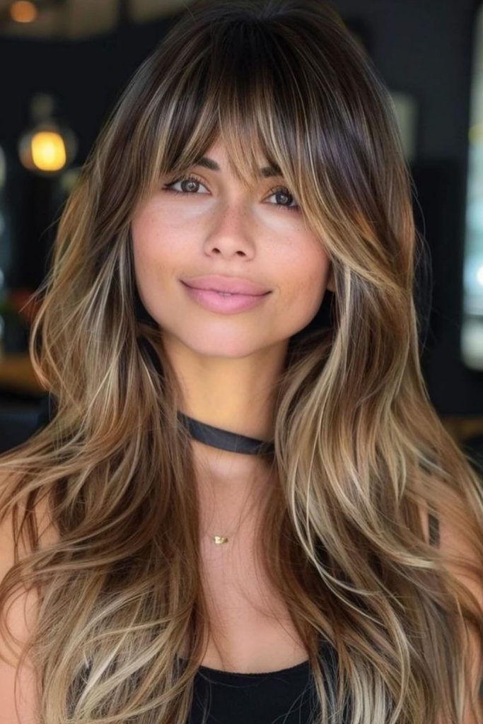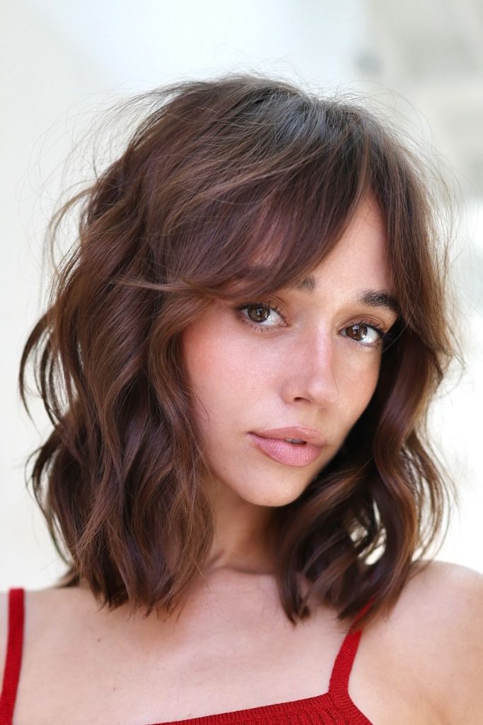 This wavy bob with light bangs brings out true beach vibes. The soft waves and loose fringe suit round or oval faces perfectly. I tried this look on vacation last summer, and it was effortless to style. Use a curling wand for easy waves and finish with a touch of hairspray. It’s the ideal pick for your summer board or your next beach day!