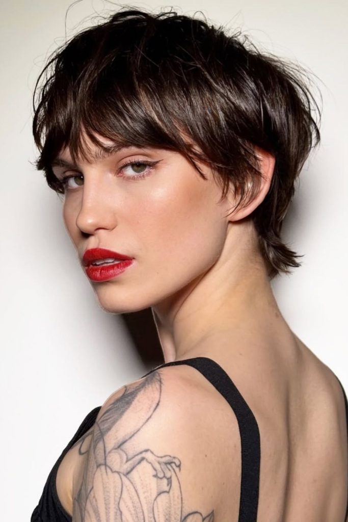 “This short pixie with messy bangs is light and fun. It looks good on all face shapes. The soft waves make it playful and cute. Style it for a night out and shine. A bit of pomade keeps it in shape. Try this cut next time you want a new look!”
