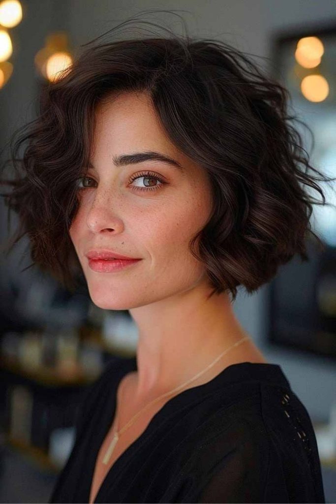 Highlight your curls with this fun bob and curly bangs. It’s light, carefree, and looks lovely on oval faces with wavy hair. I tried it on a beach trip, and it was so simple to handle yet looked great. Apply curl cream to add bounce and volume. Between washes, revive your curls with a water mist or leave-in spray. Fighting frizz? Drop your best tips in the comments!
