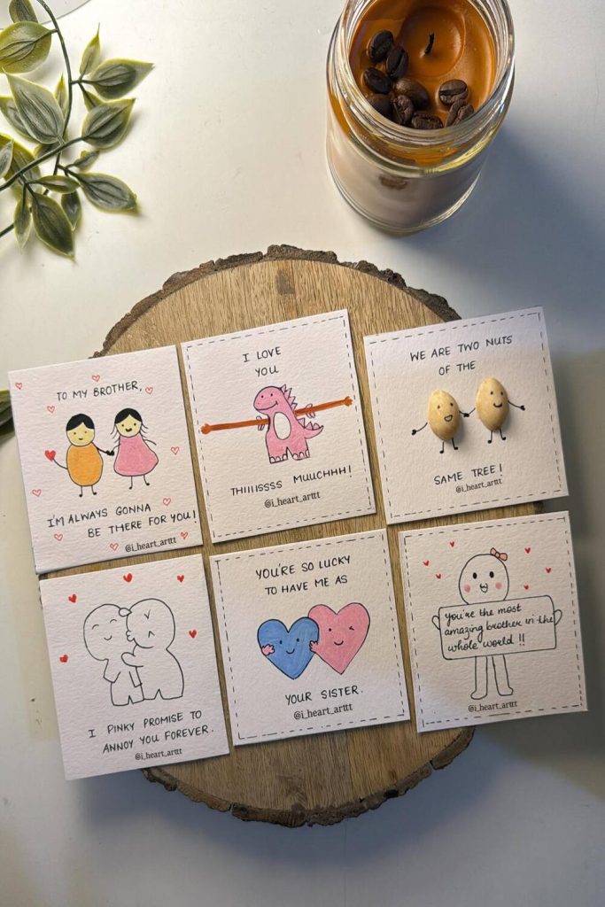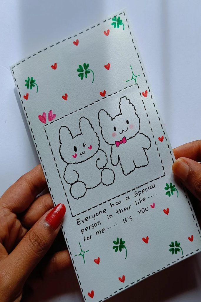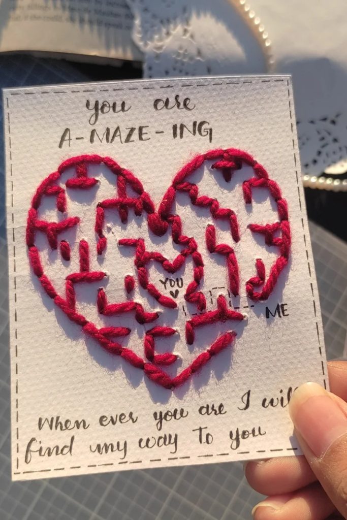 Use a quick stitch on cloth in a small ring. Write: “You are my joy.” I used thread that changed color. It looks very soft. It is great for a small table. If you are new to stitch work, trace the words first. Use a pen whose ink goes away with heat.