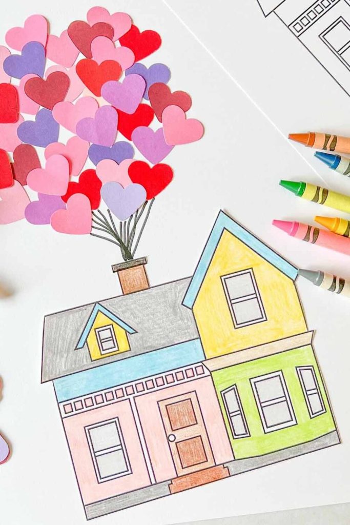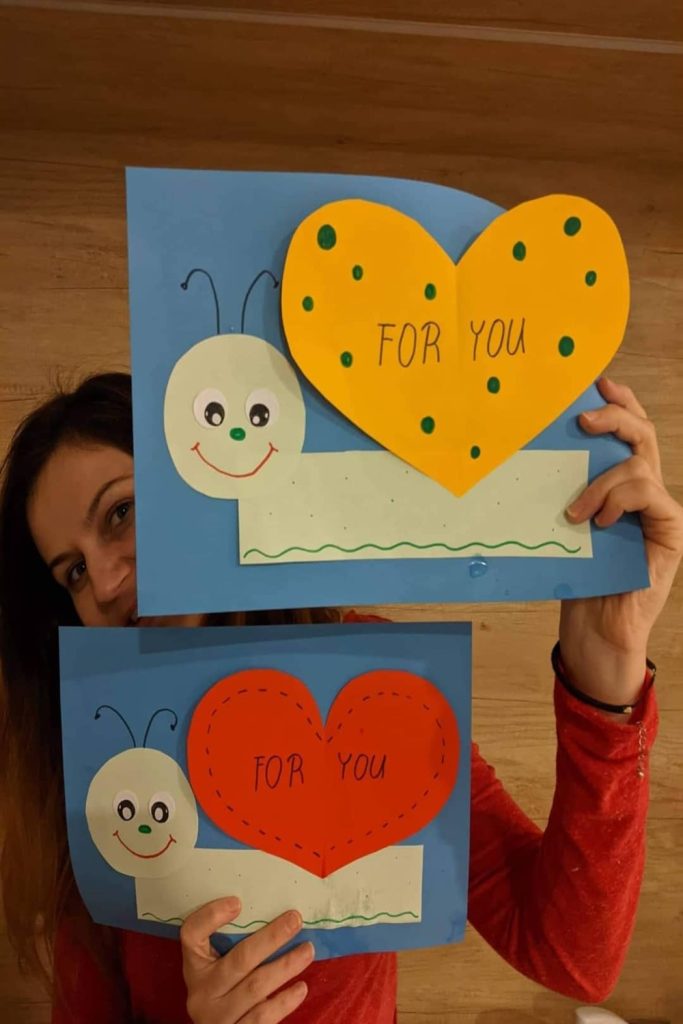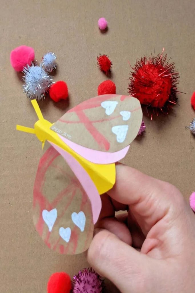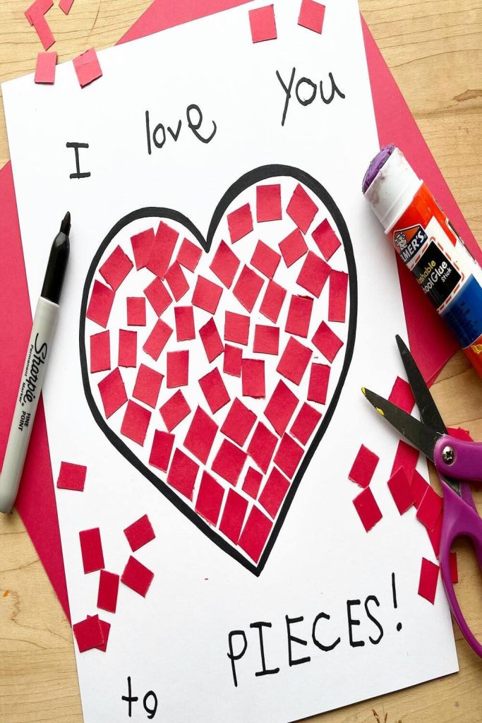 Plates, soft sticks, and small eyes make cute love bugs. Paint the plate. Fold it in half. Poke small holes for the head and legs. Let your kids use felt and bright dots. We wrote notes like “You’re my love!” We taped them on desks. This is great for small kids.