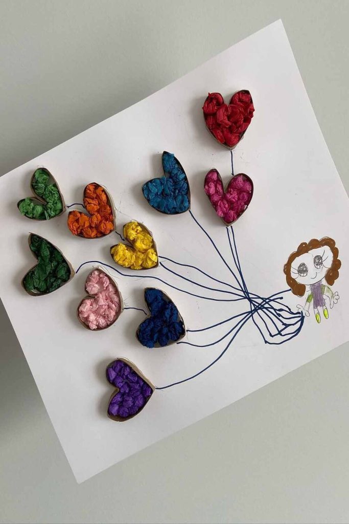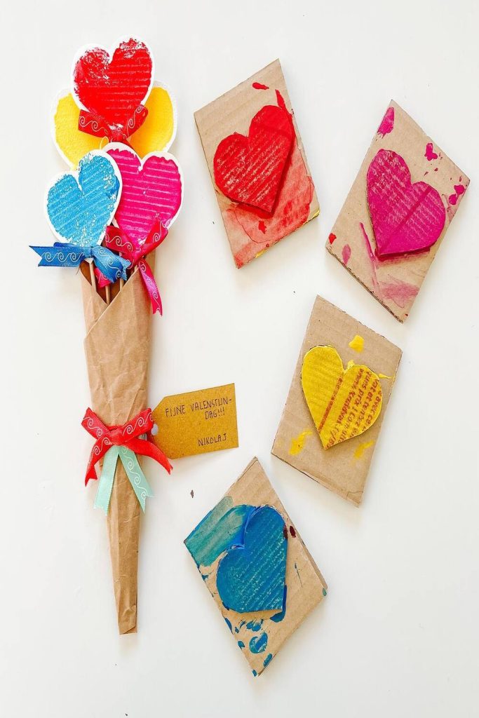 I like these soft yarn hearts the best. Cut hearts from a box. Get yarn in pink, red, and white. Let kids wrap the hearts. Add a bead and a string loop. Look! It is a great gift! The yarn feels soft. The shades look new. This is good for small kids (with help). It is good for big kids who like to wrap. Hang them on doors. Or, make a long line of them. It is clean and nice.