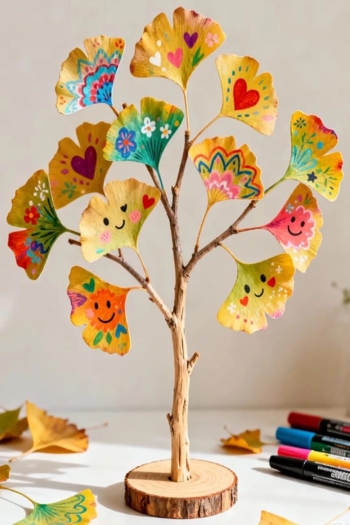 Draw tree lines with a brown pen. Kids dip hands in paint. They make heart-shaped leaves. I put a wood frame on my son’s tree. It still hangs on our wall. This is a sweet thing that grows with them.