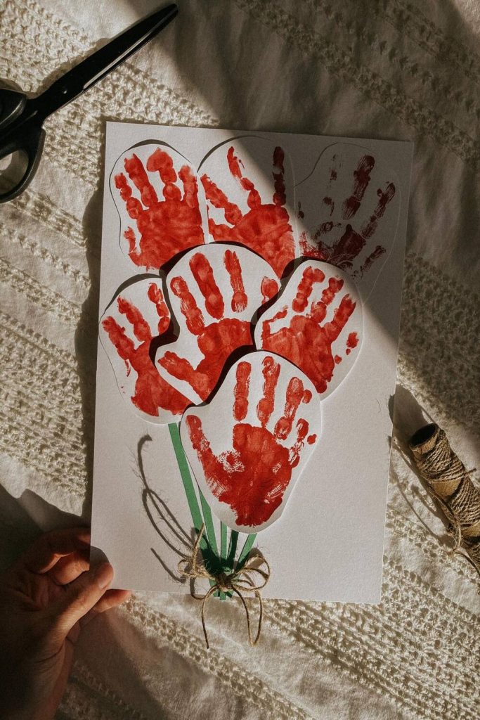 Make a plain jar a sweet gift. Dip your child’s thumb in red paint. Press two prints to make a heart. Do this all over the jar. Tie a string on top. Fill it with a treat. My child still wants to make them. Tip: use craft paint. Use a clear seal to make it last.
