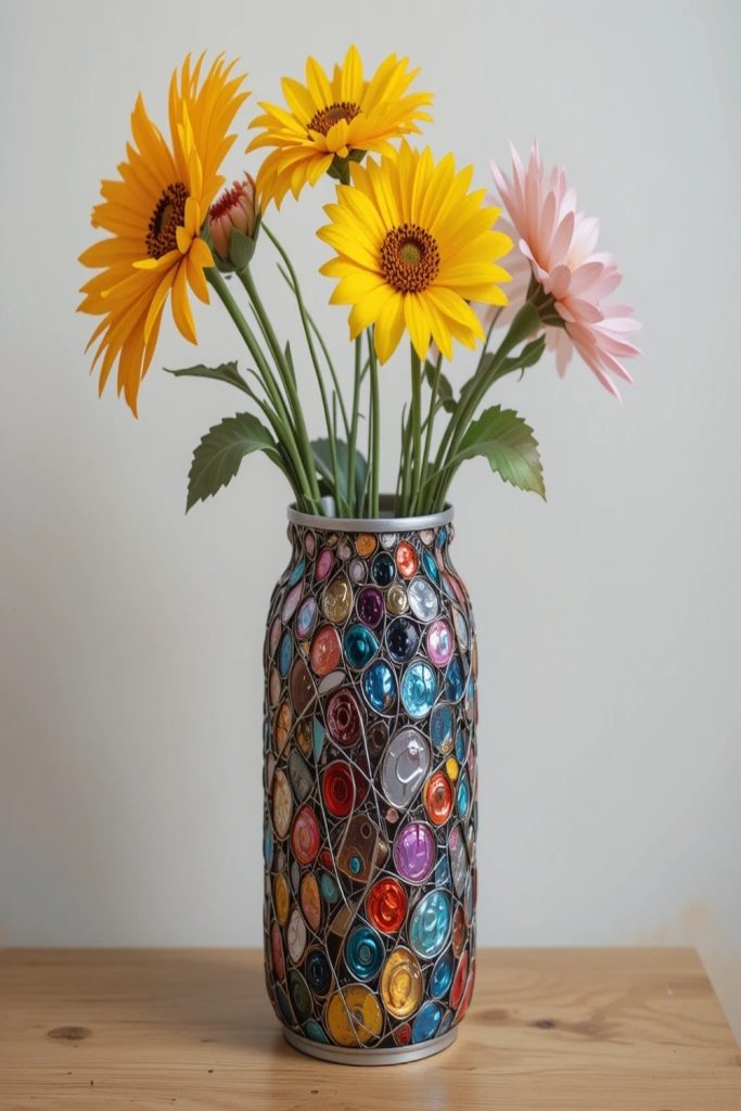 12. Mosaic Bottle Cap Vase: Vibrant Upcycled Mosaic Magic