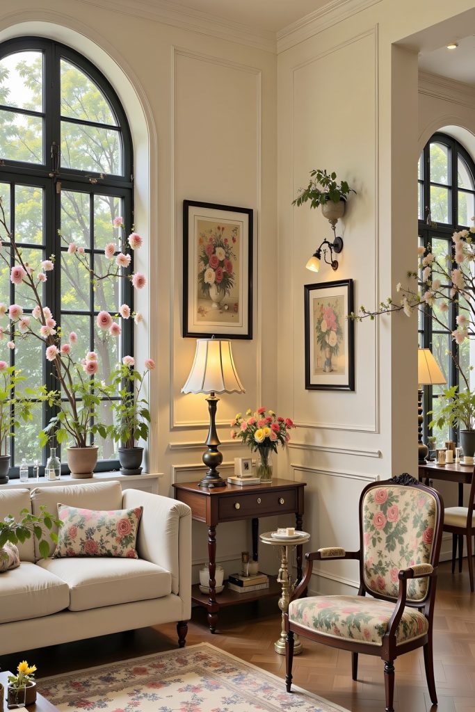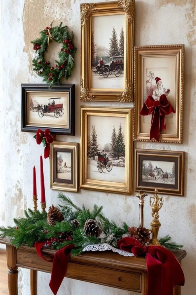 This picture wall is a goal! Dozens of real 1920s to 1950s valentines hang. They are in different gold frames. The frames climb up a soft green wall. Some cards fold out. Some move. They are all slightly bent and faded. The gold frames and tiny dried flowers look great. It feels like a love story you can see every day.