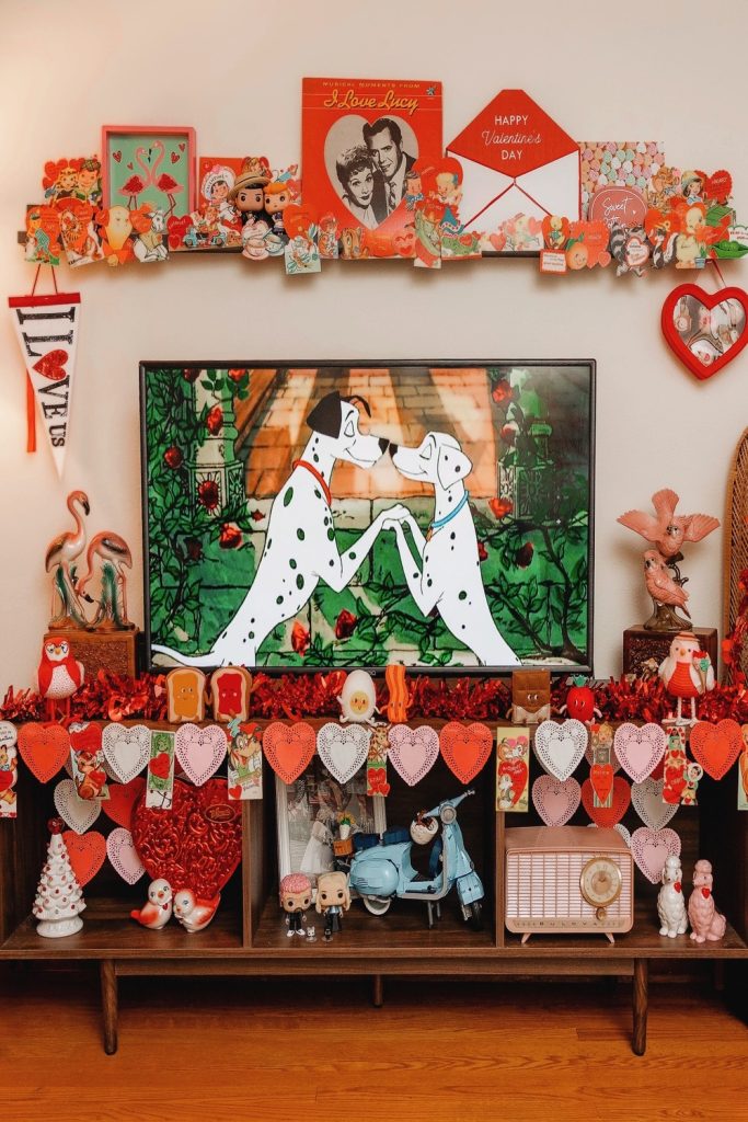 This fireplace shelf is just perfect! Layers of old, faded valentines sit gently. They lean on a chipped white fireplace. Add small, light pink brush trees. Include the softest rose string I have ever seen. A string of tiny paper hearts hangs near the mirror. It looks like frozen confetti. This style feels like 1940s love letters. It also feels cozy and simple. Every piece looks found or passed down. This is great if you want that “grandma’s attic” romance. It has no mess!